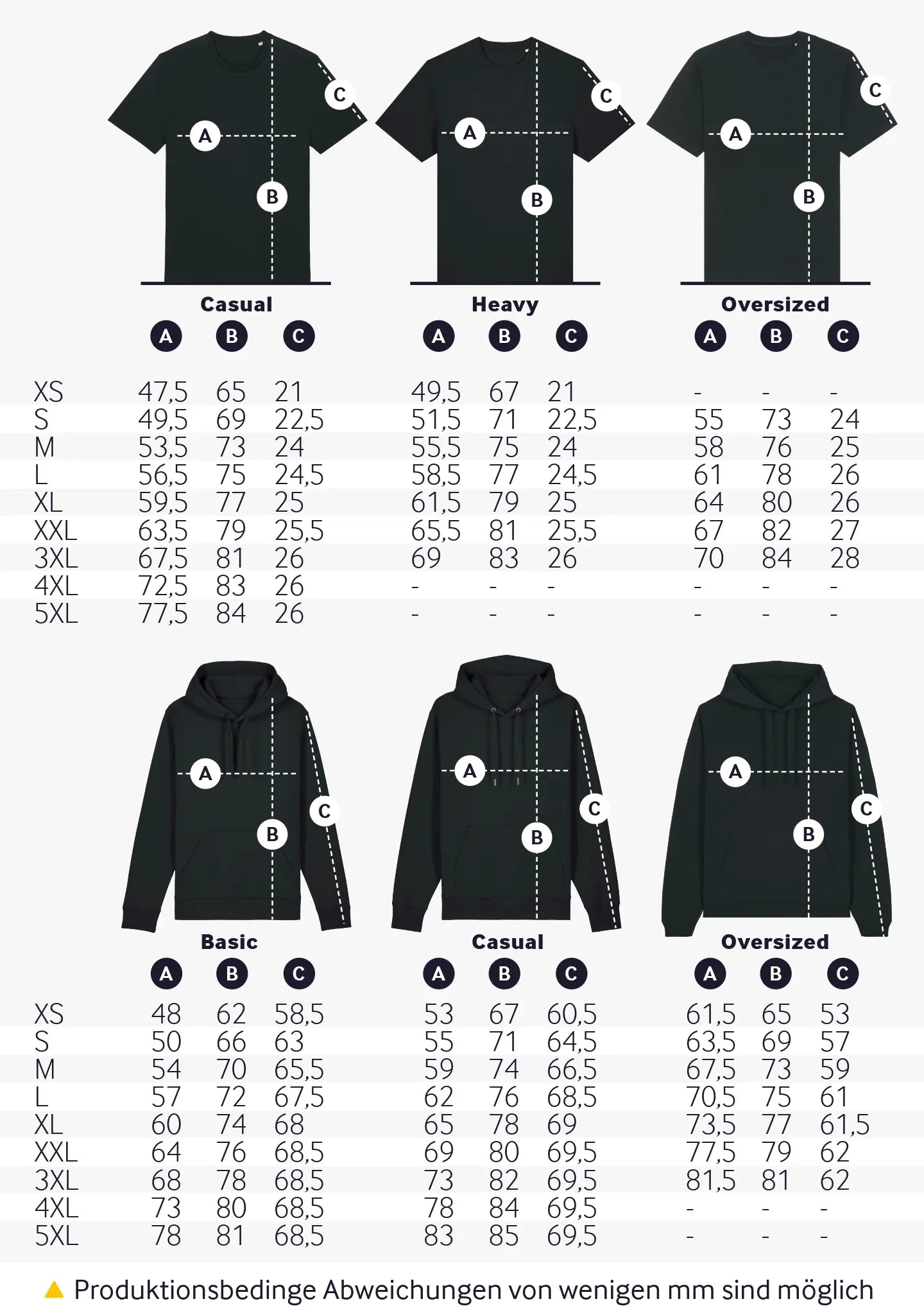 Hier siehst die die Größentabelle für unsere Bekleidung. Allgemein fällt unsere Bekleidung normalgroß/europäisch aus – du solltest also deine Standardgröße auch bei uns nutzen können.