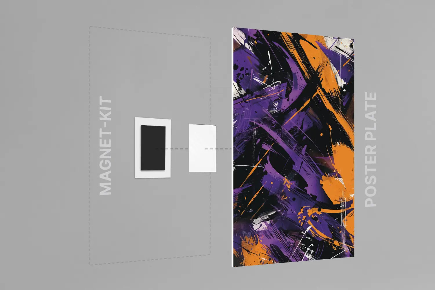Dank des innovativen Magnet-Kits lassen sich Poster Plates in weniger als einer Minute aufhängen bzw. austauschen. Ohne Bohren, ohne Hämmern, ohne Rahmen.