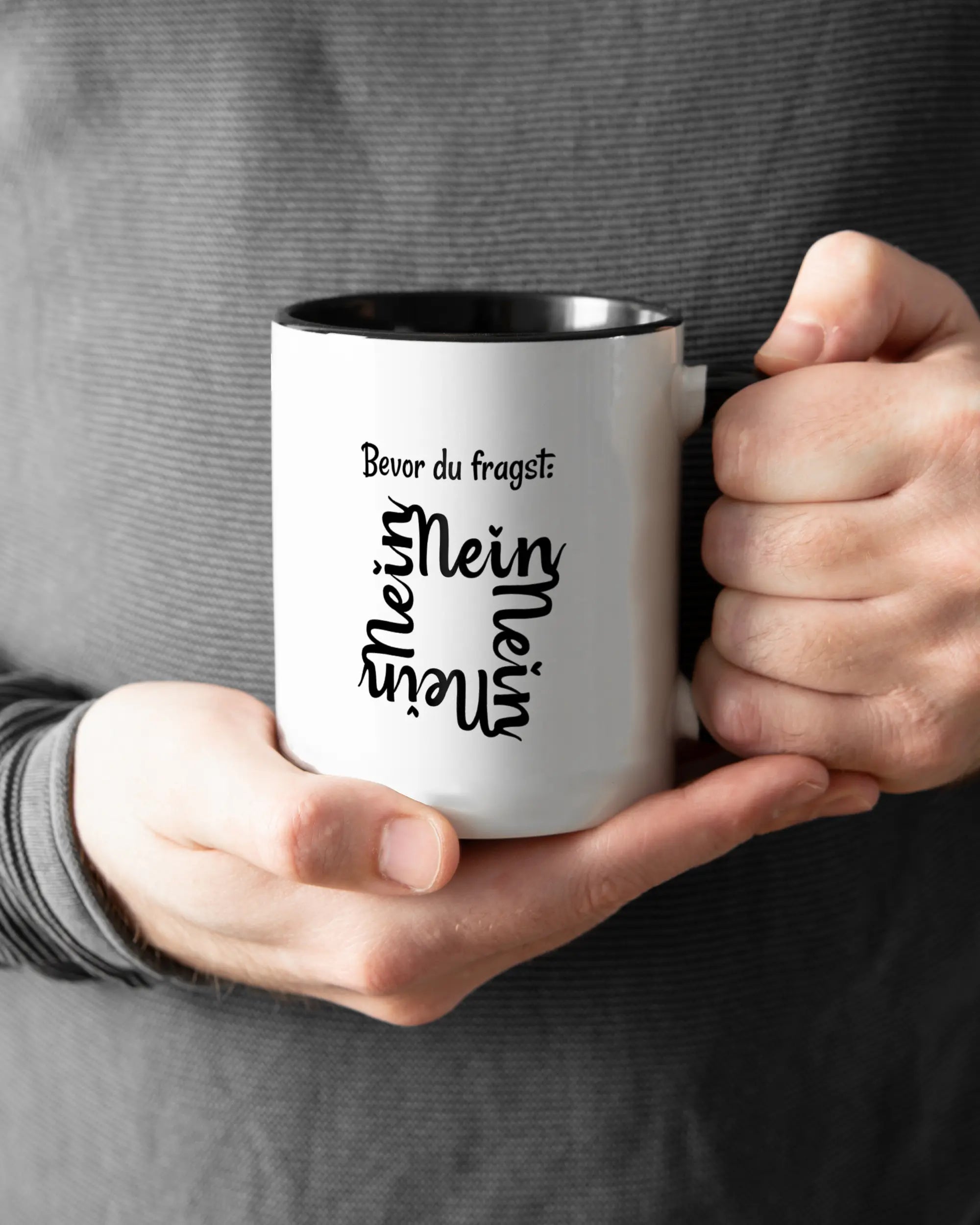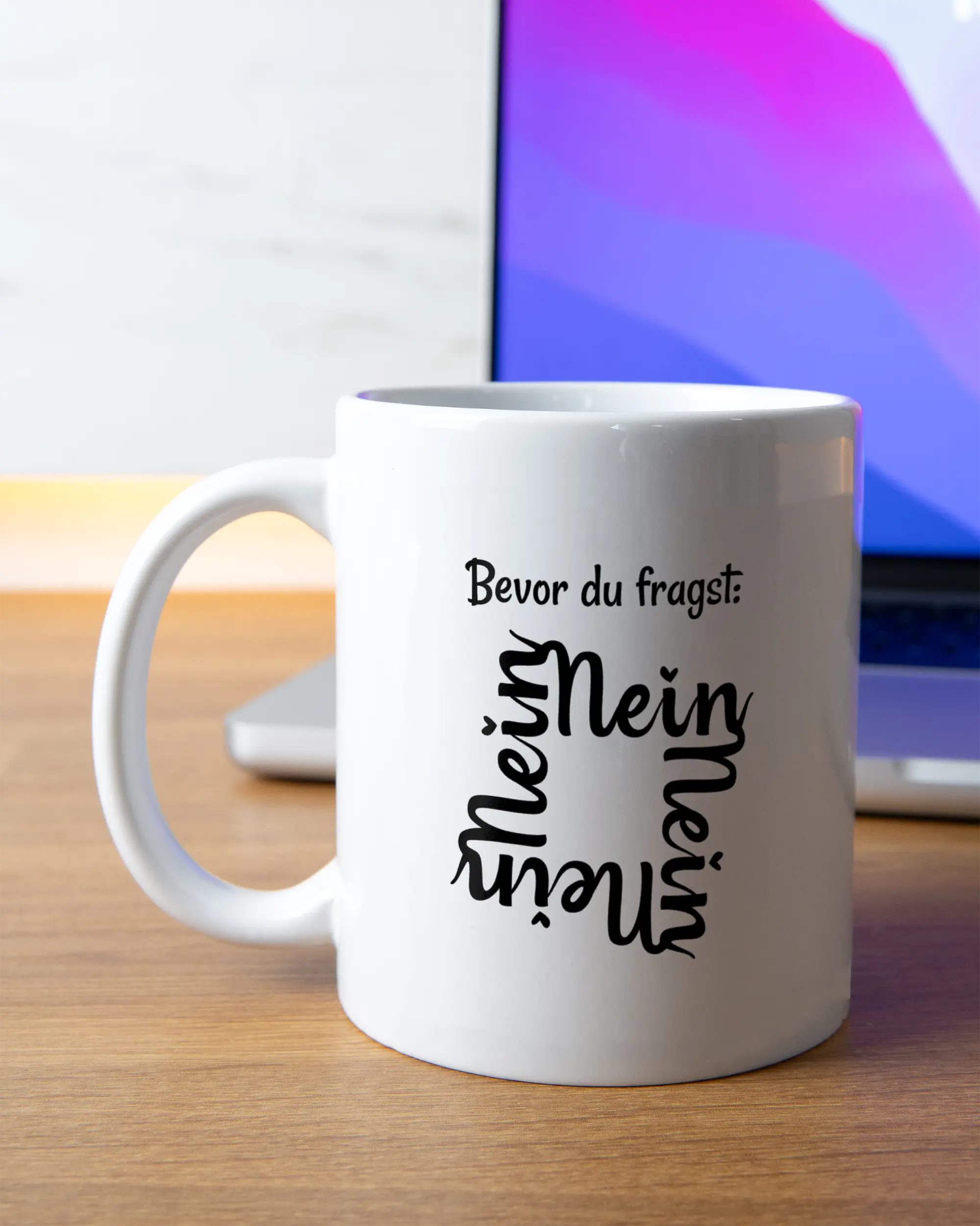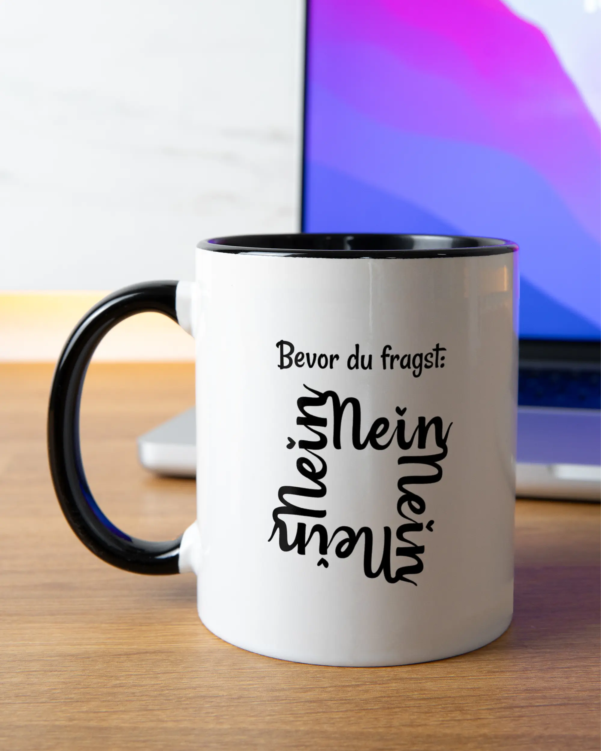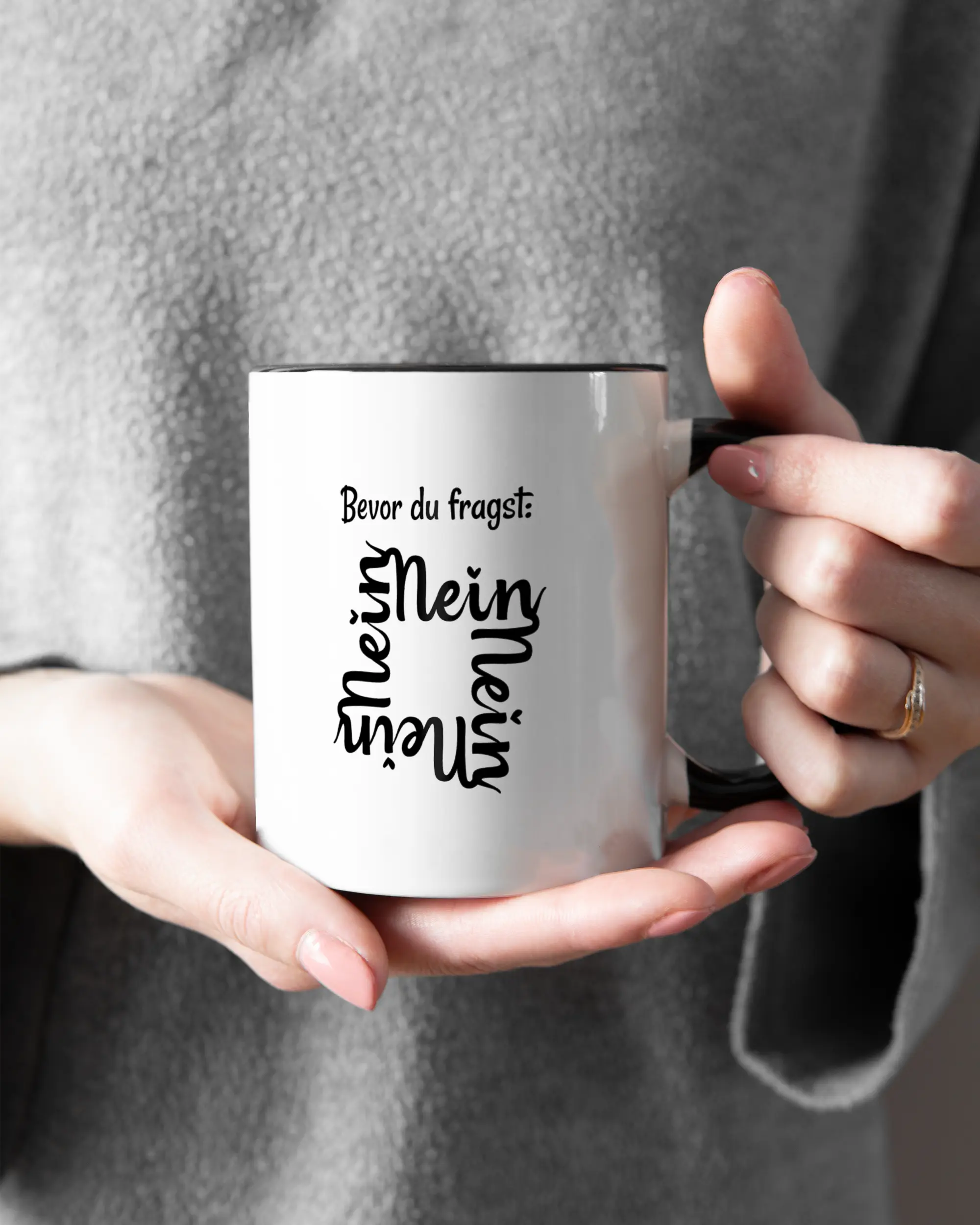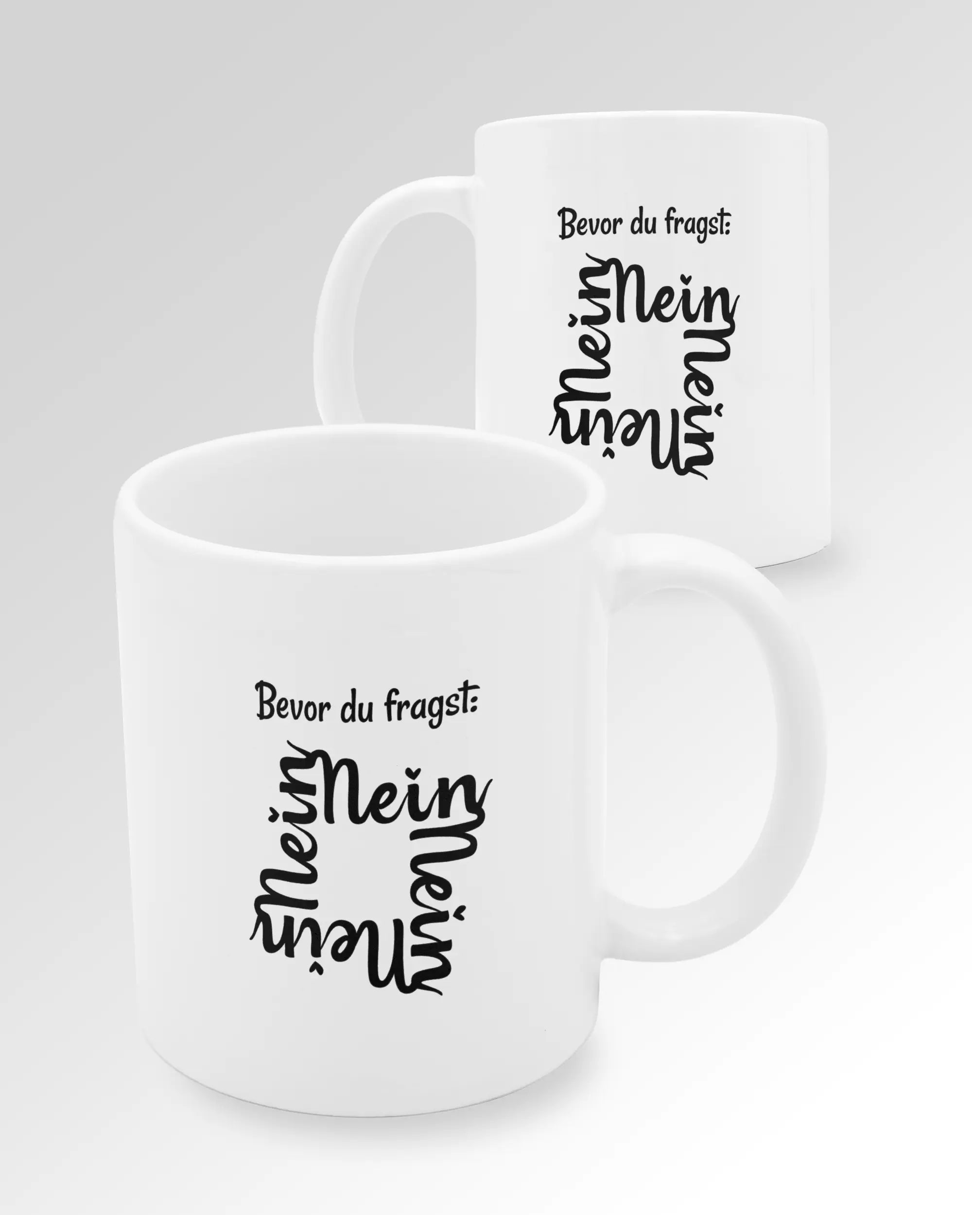 Unser Tassen Design „Bevor du fragst“ ist in drei verschiedenen Farben erhältlich. Bereit für eine echt stilvolle Tasse, für die dich jeder vergöttert? Dann empfehlen wir dir die Tasse Schwarz-Weiß. Du suchst eine schlichte weiße Tasse ohne Schnick-Schnack? Dann ist unsere weiße Tasse genau richtig für dich. Wenn du gerne aus der Masse herausstichst und eher der dunklen Seite angehörst, solltest du ein Auge auf die schwarze Tasse werfen. Deine Farbe, deine Wahl.