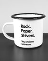 Was unsere Tasse mit dem Design „Rock Paper Shivers“ so besonders macht, erfährst du in den folgenden Abschnitten. Zuerst aber die wichtigsten Eigenschaften: Diese Tasse von Maondo besteht zu 100 % aus Emaille und wird völlig plastikfrei verpackt und versendet. Das macht sie einerseits sehr edel und robust und andererseits schadet es Mensch und Natur deutlich weniger. Du suchst eine coole Tasse, die in jeder Umgebung eine gute Figur macht? Deine Suche hat ein Ende!