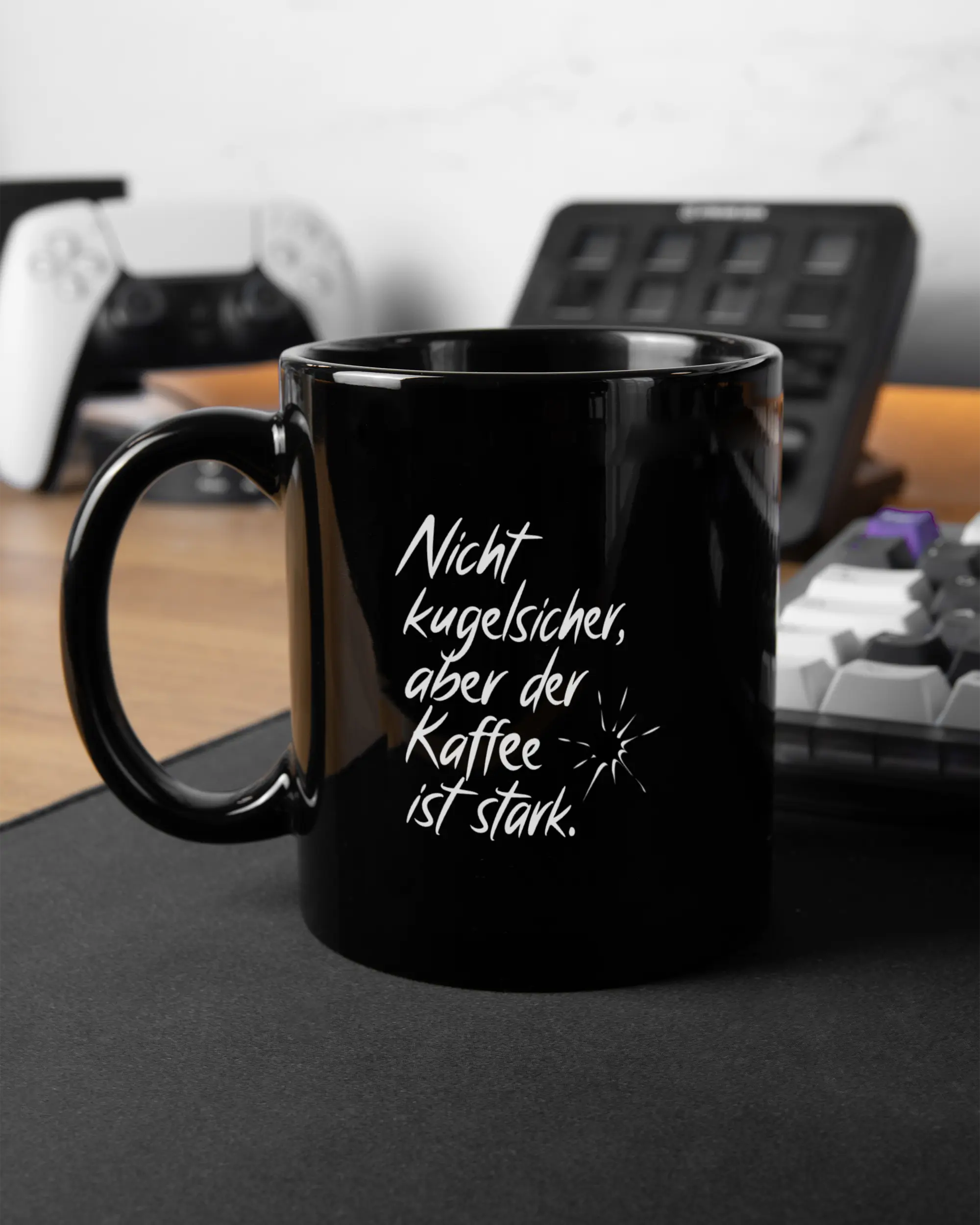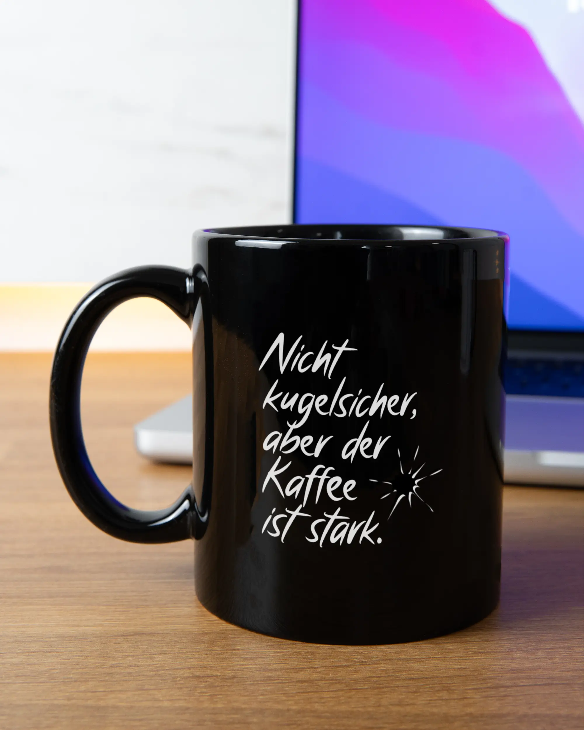Genieße dein starkes Heißgetränk in der (besorgnis)erregenden Tasse in Schwarz.
