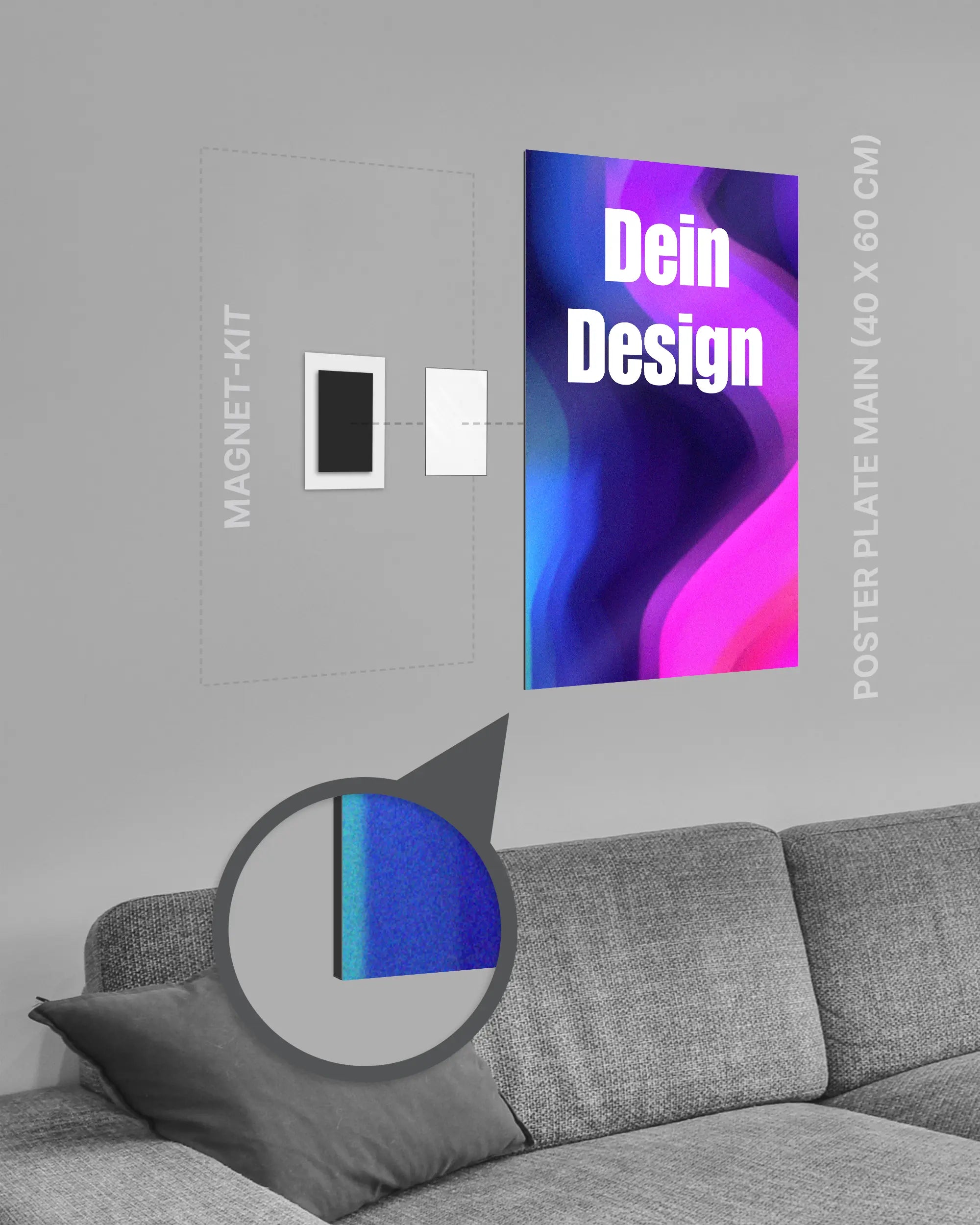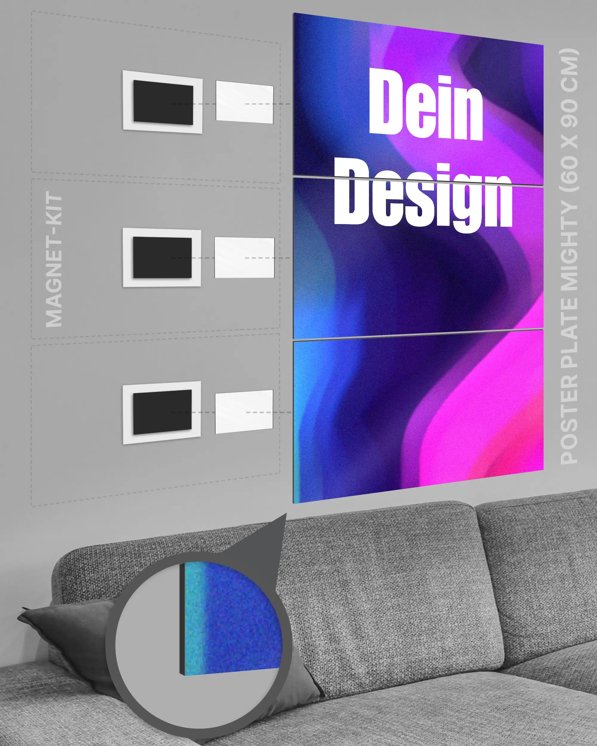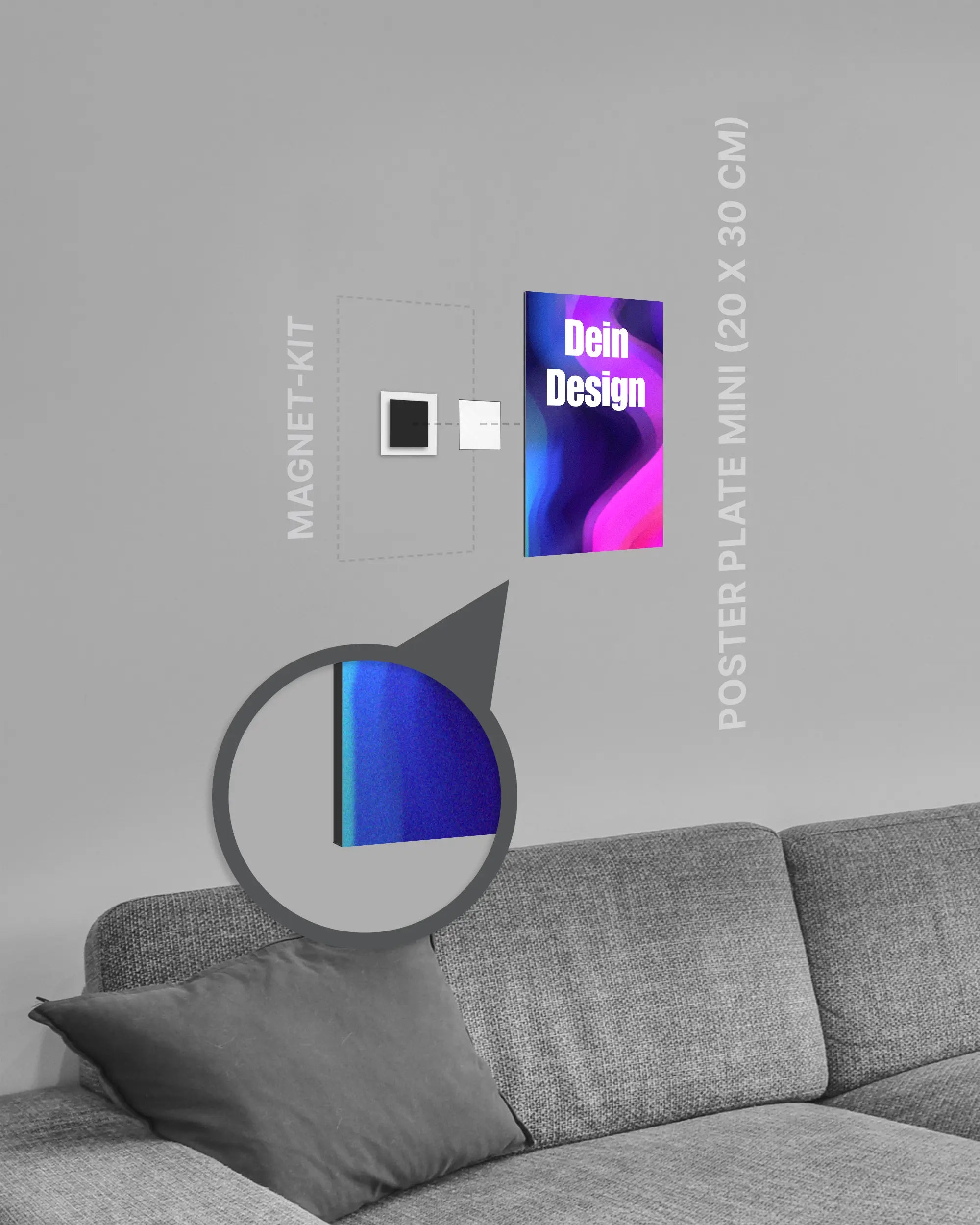 Löse die Schutzfolie des kleineren Magneten und klebe das gesamte Magnet-Kit mittig auf die staubfreie Rückseite der Poster Plate.