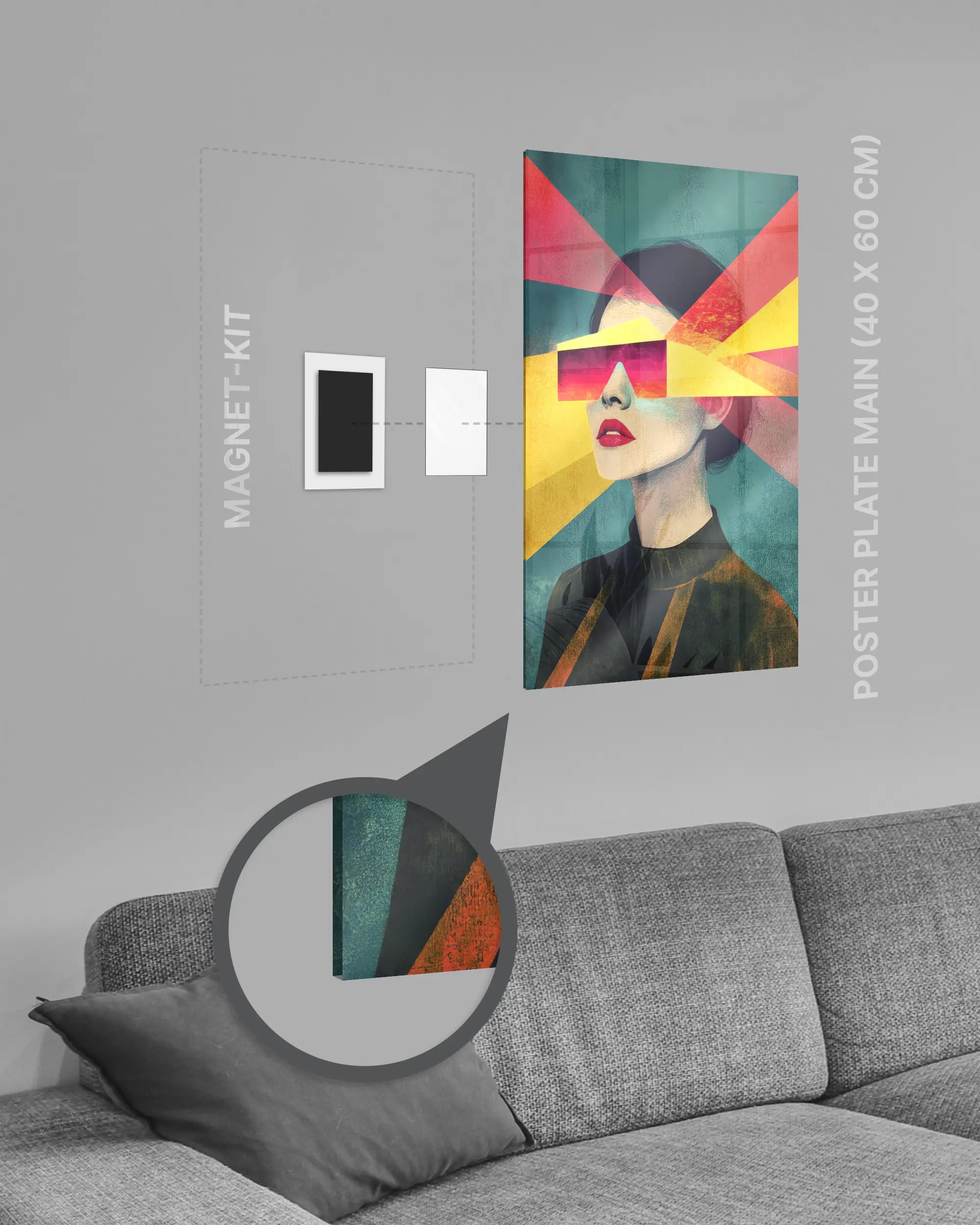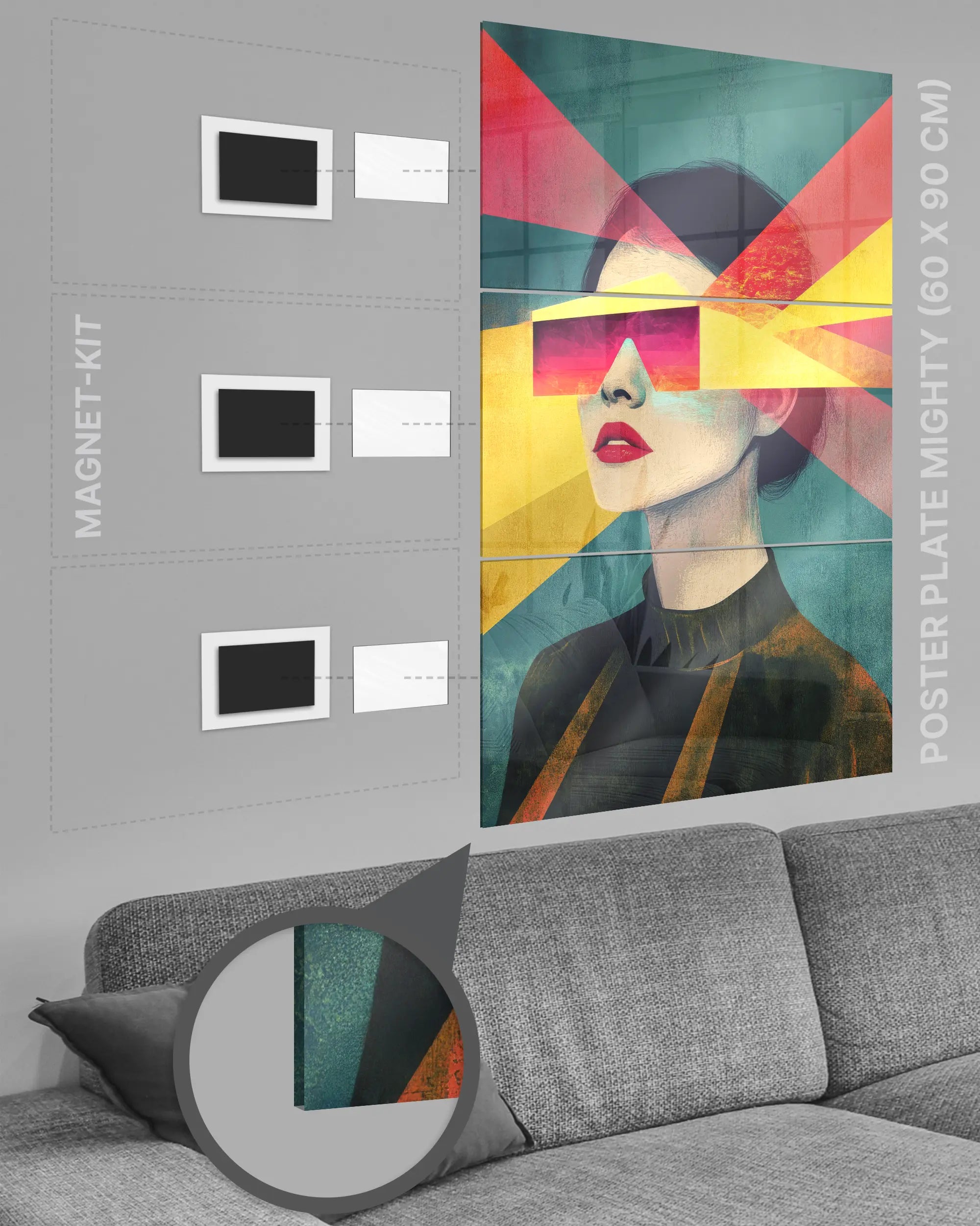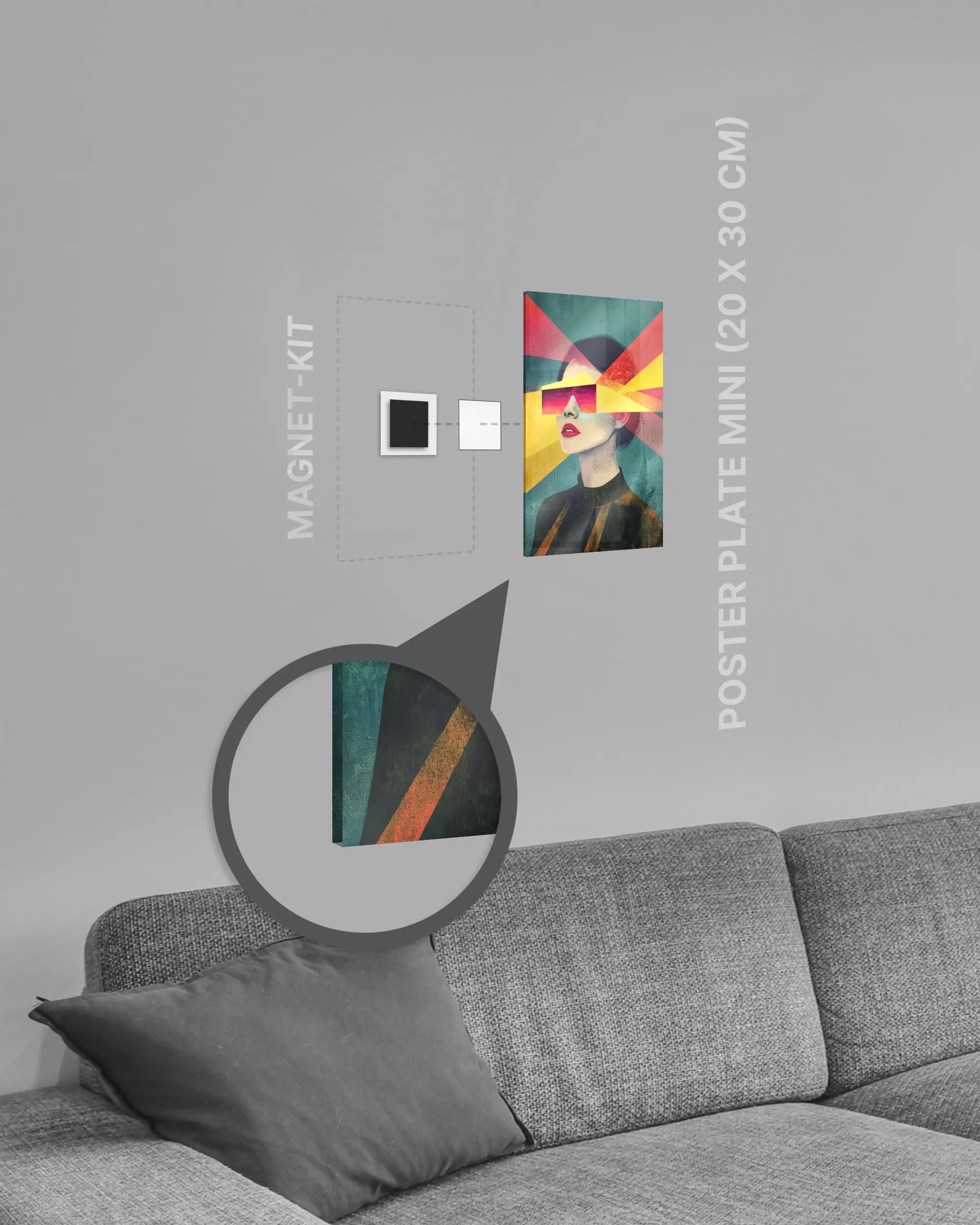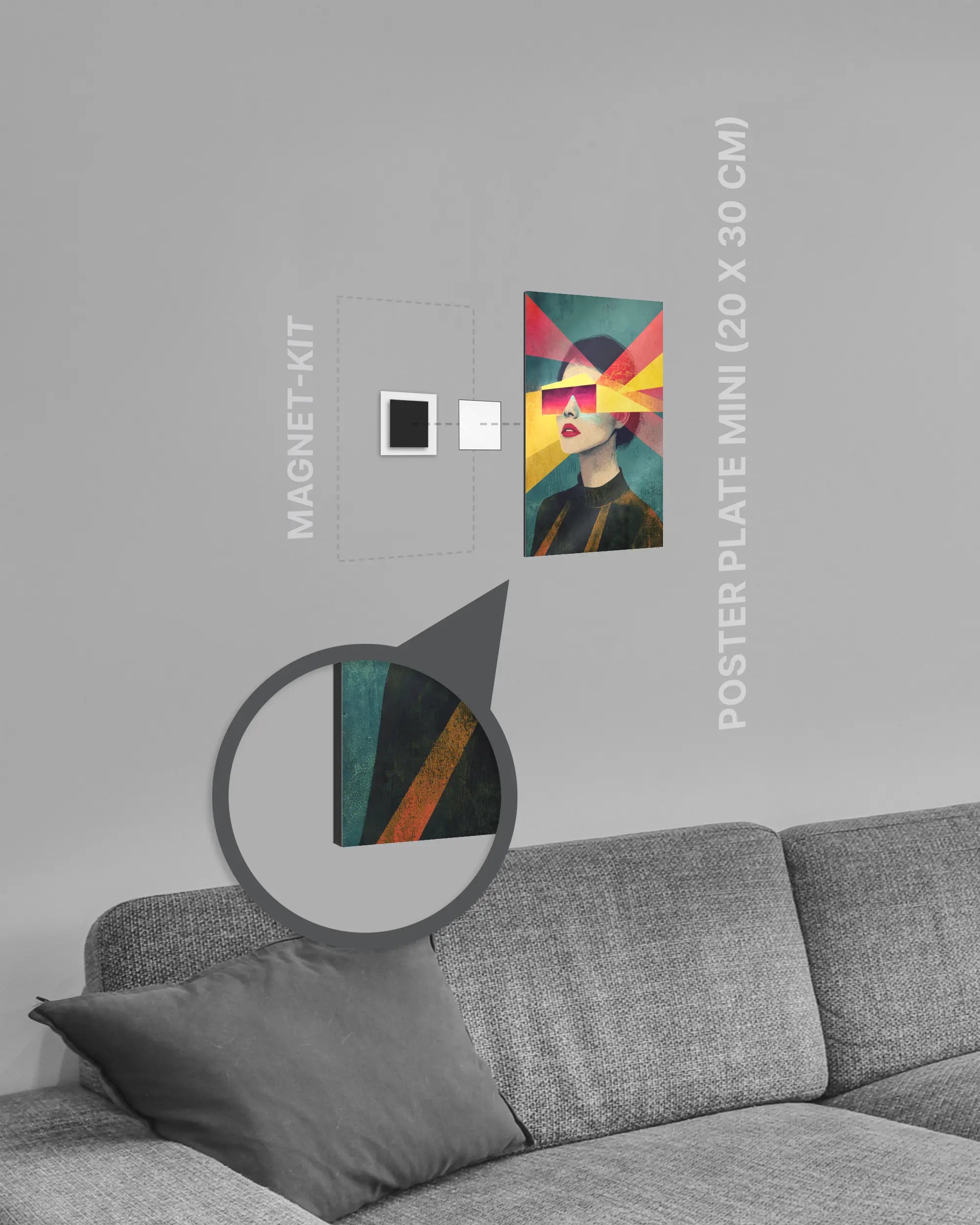 Deine Poster Plate wird mit dem jeweils passenden Magnofix® Magnet-Kit geliefert. Dadurch lässt sie sich an fast allen geraden Flächen aufhängen.