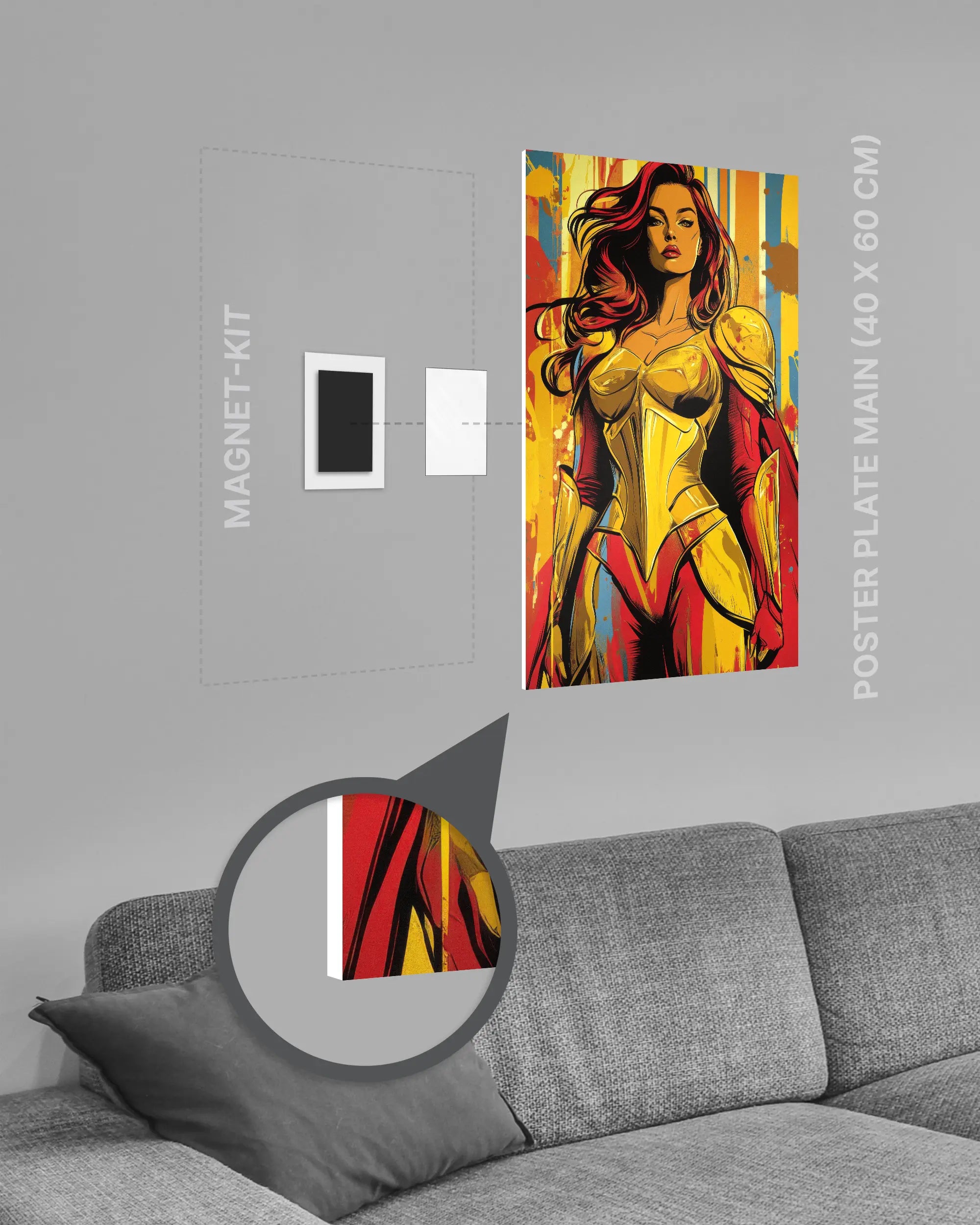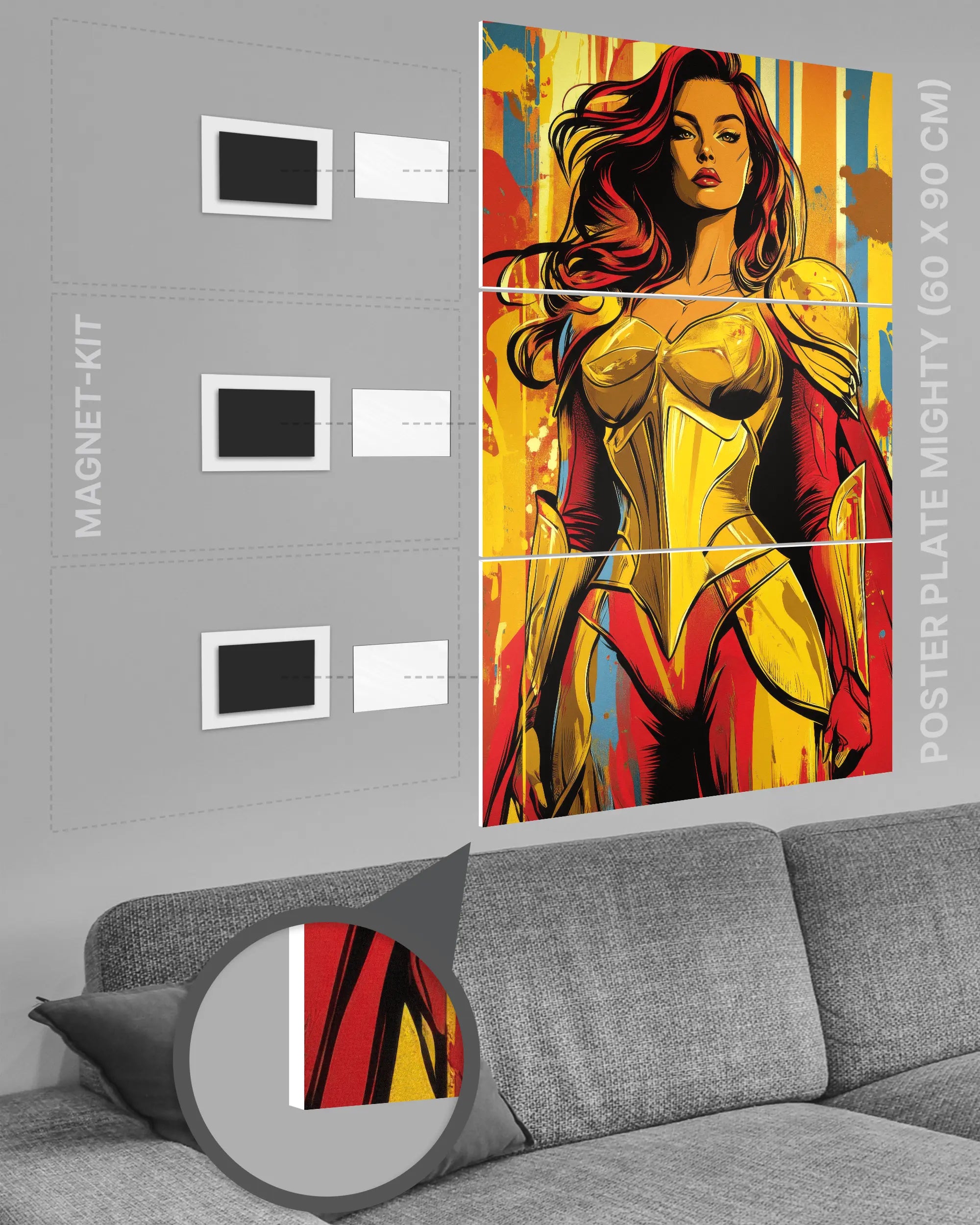 Bei deiner „Frau Streitkraft“ Poster Plate ist das Magnet-Kit inklusive. Damit kannst du das Kunststück ganz ohne Bohren, Hämmern oder Rahmen an die Wand hängen und genießt dabei folgende Vorteile: