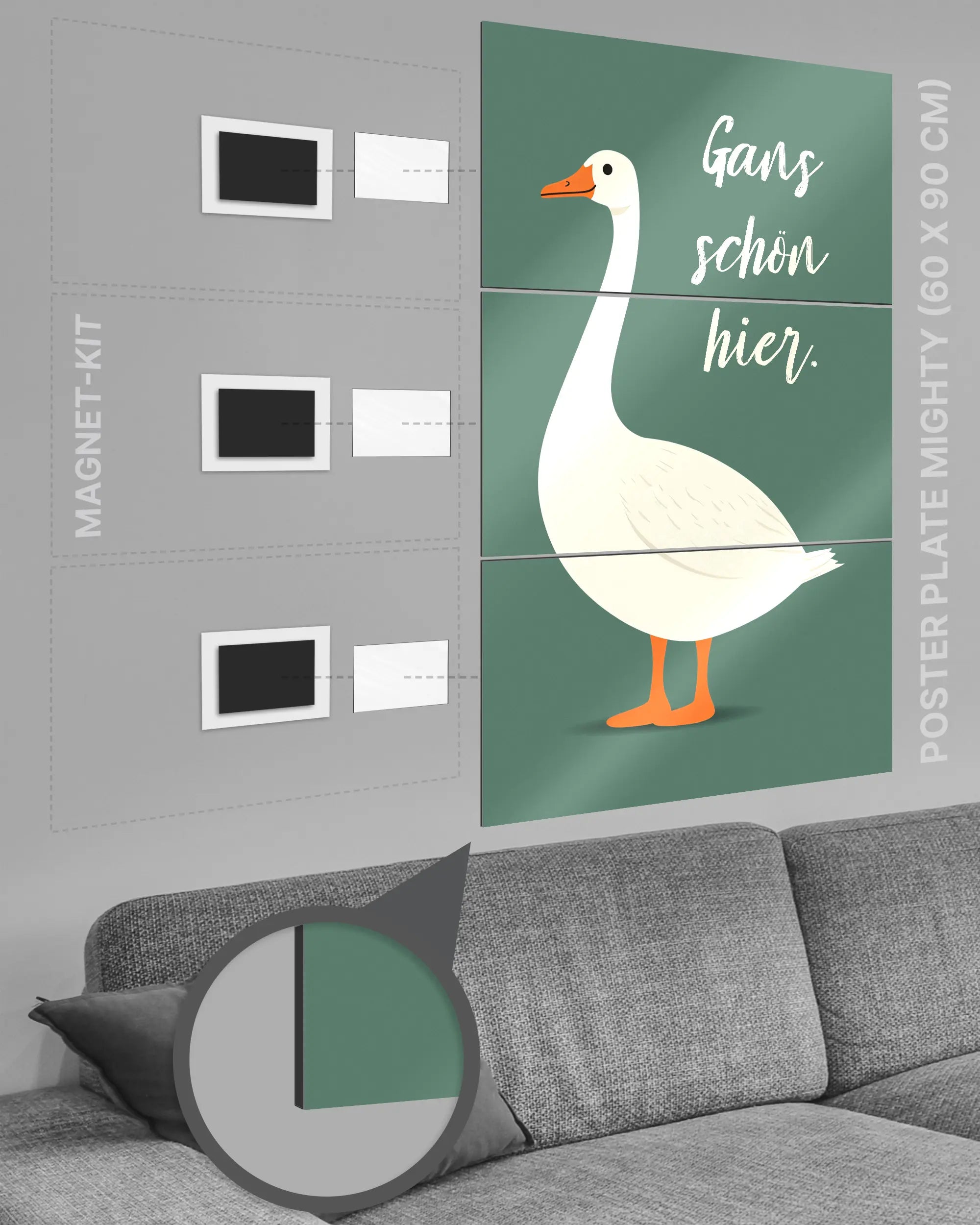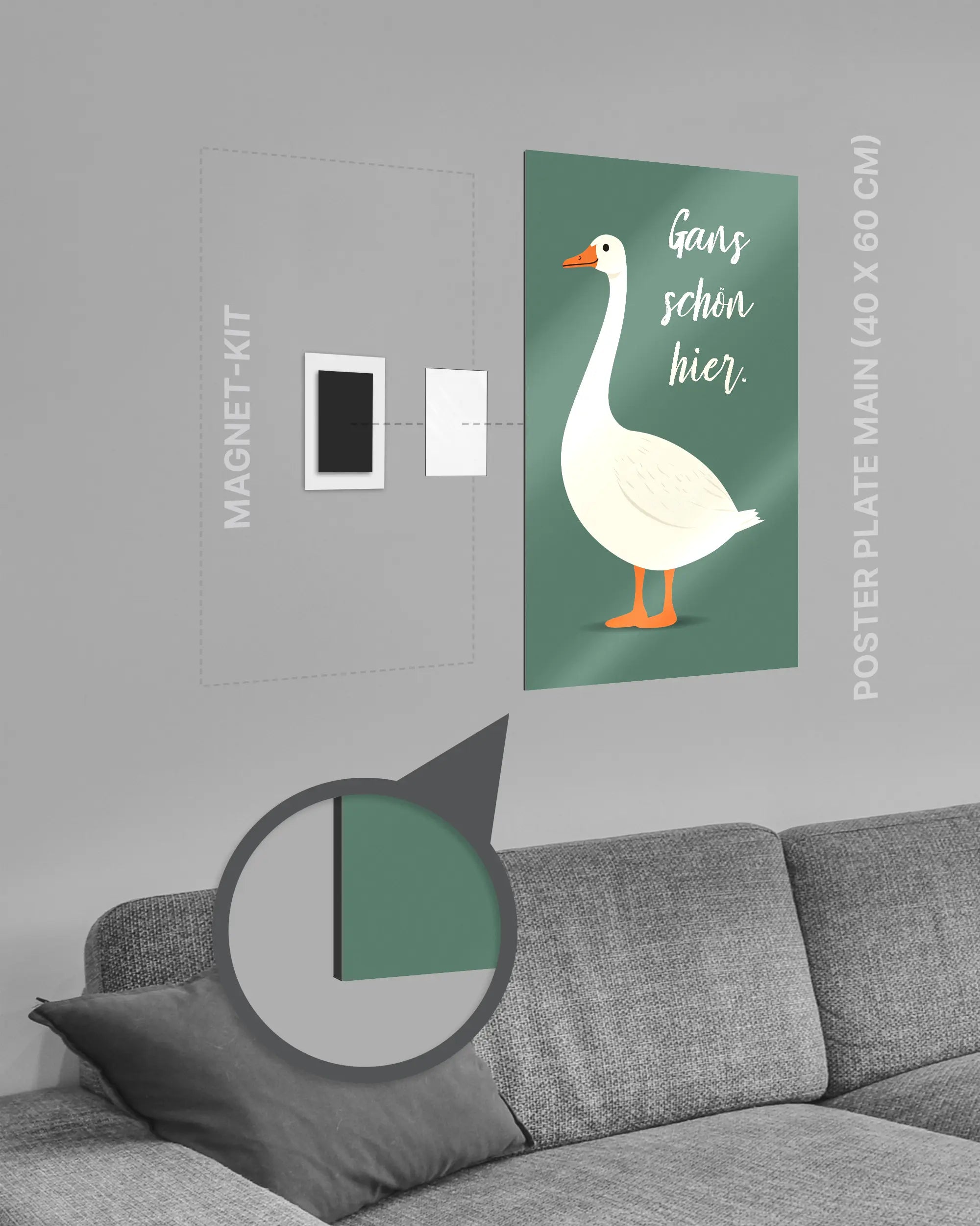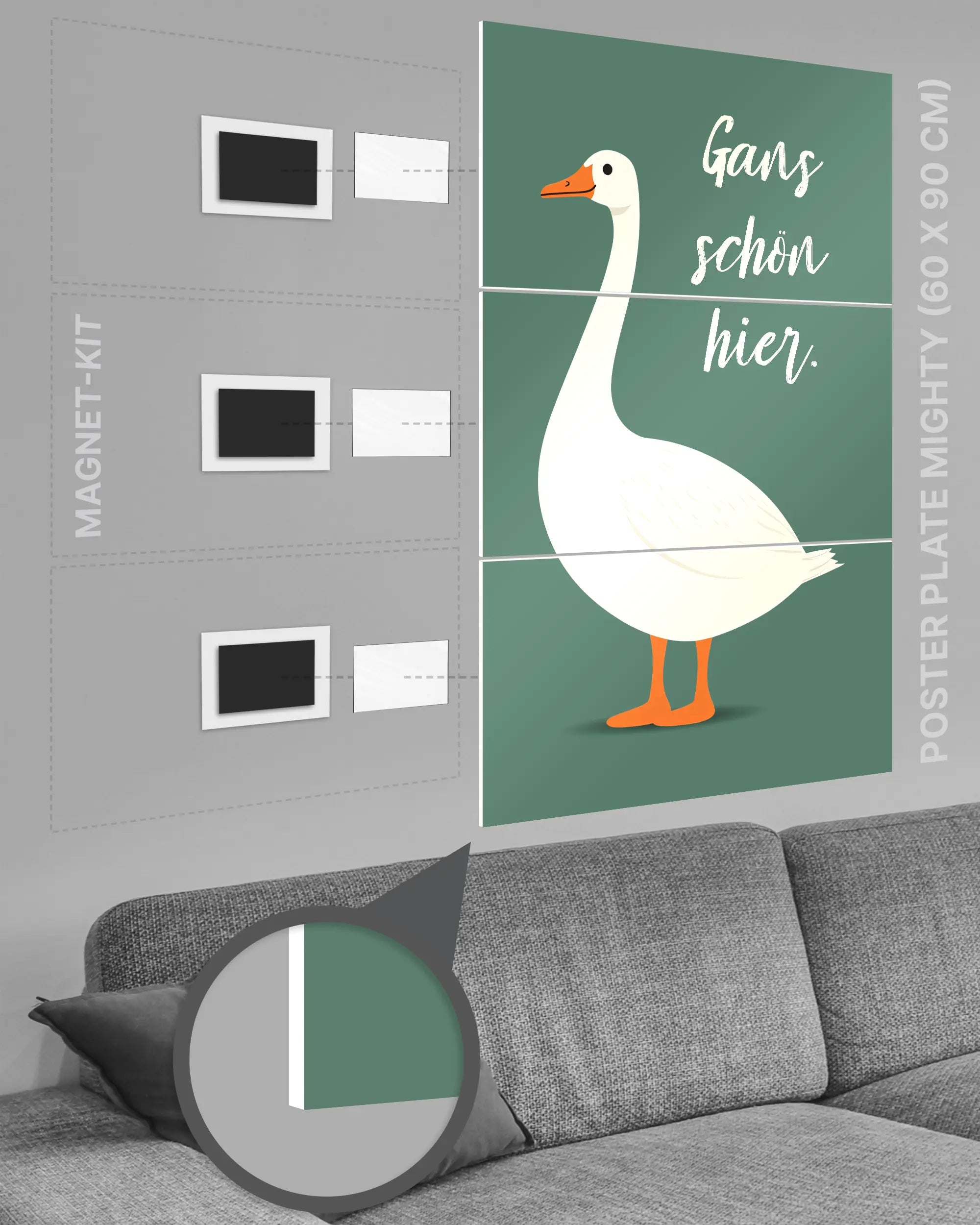 Bei deiner „Gans schön hier“ Poster Plate ist das Magnet-Kit inklusive. Damit kannst du das Kunststück ganz ohne Bohren, Hämmern oder Rahmen an die Wand hängen und genießt dabei folgende Vorteile: