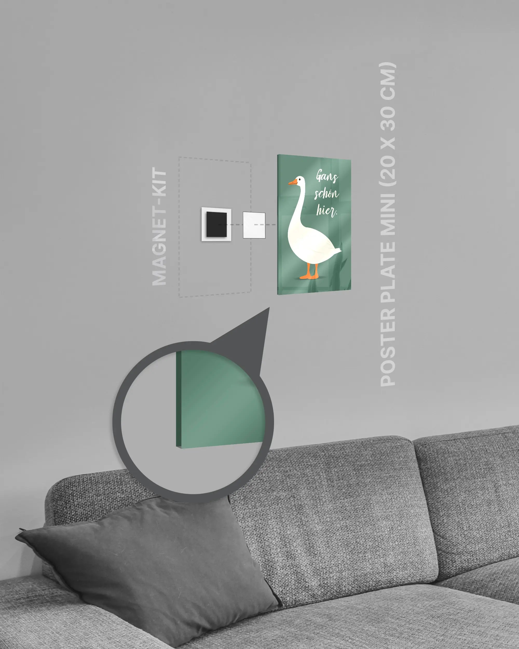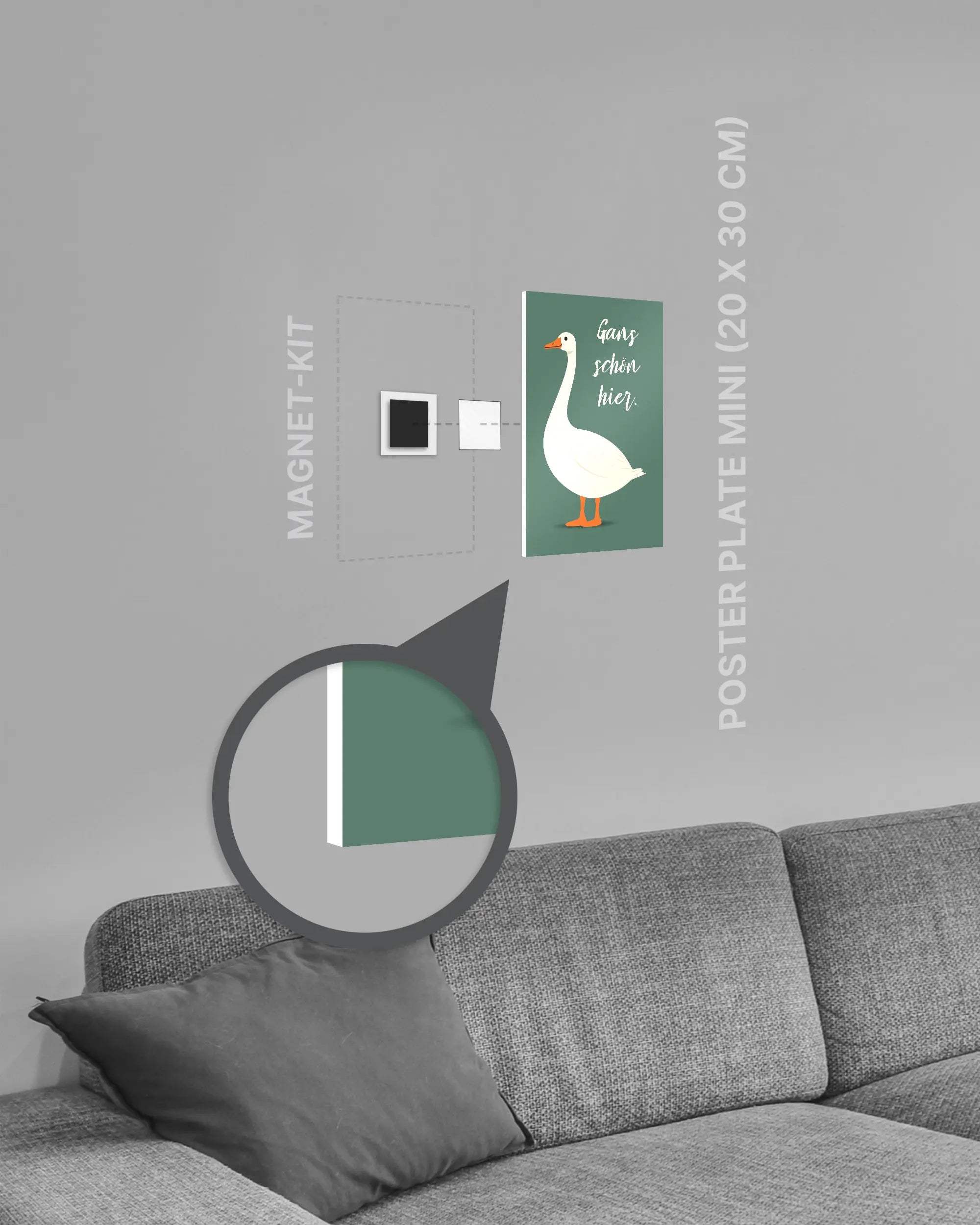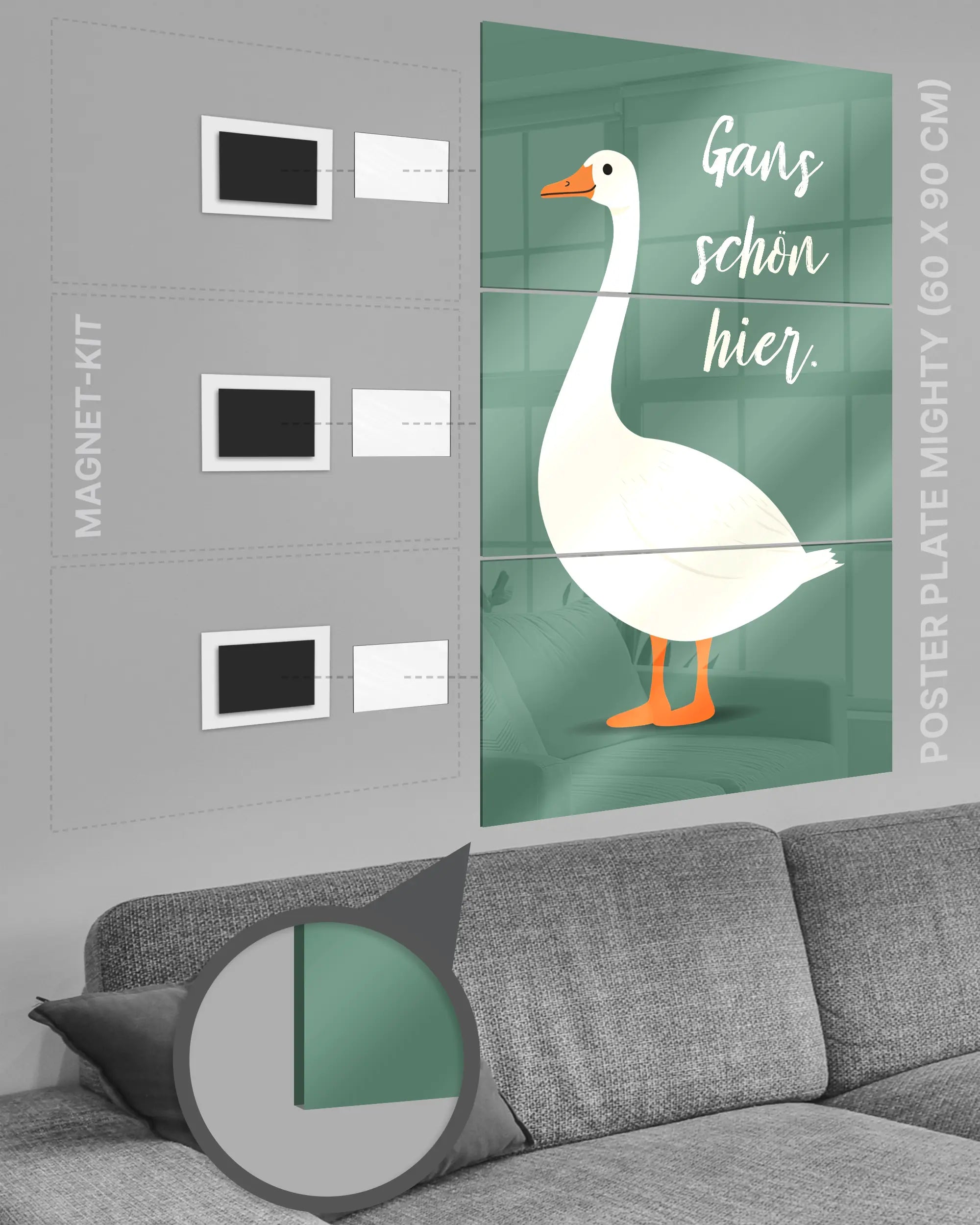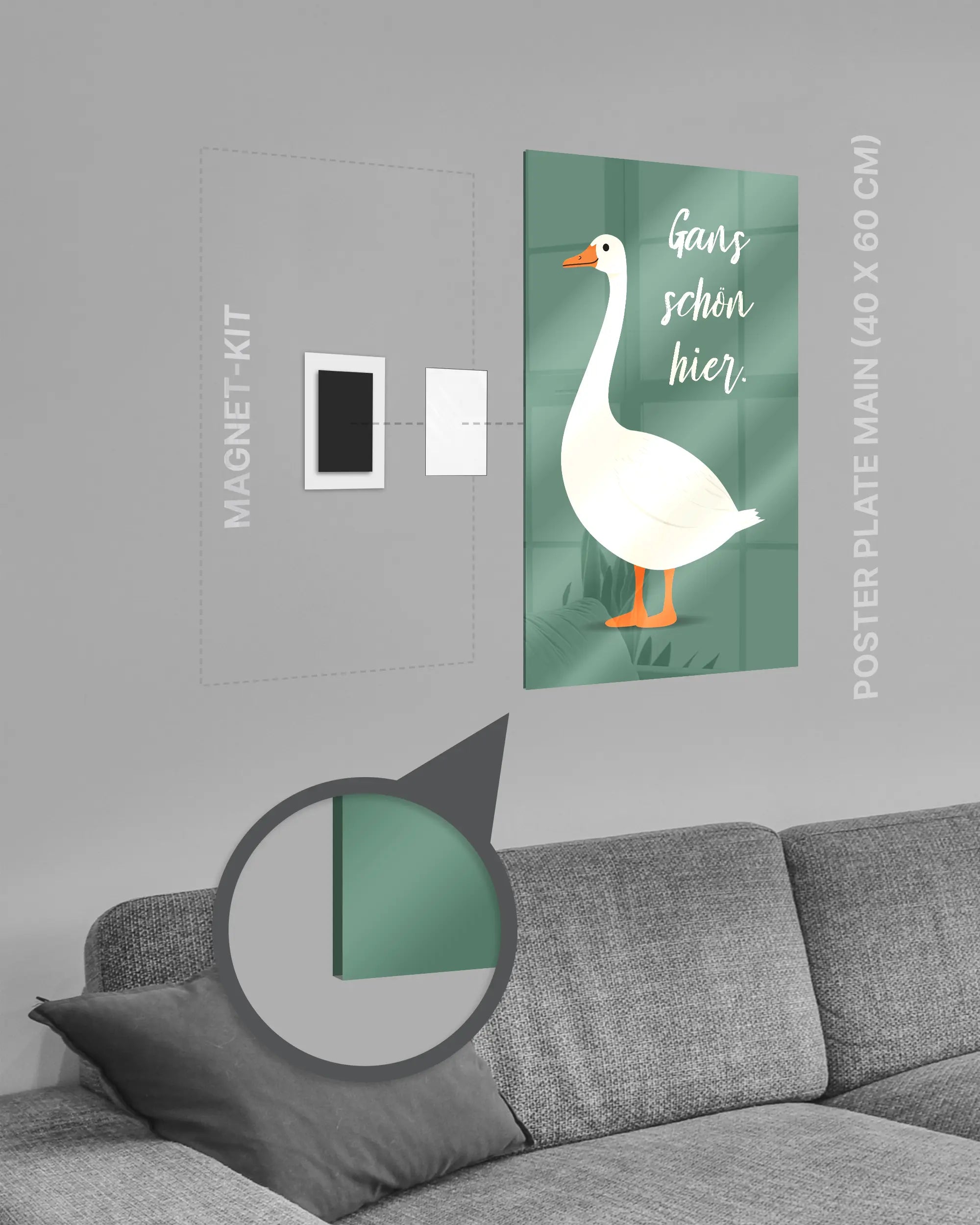 Bei deiner „Gans schön hier“ Poster Plate ist das Magnet-Kit inklusive. Damit kannst du das Kunststück ganz ohne Bohren, Hämmern oder Rahmen an die Wand hängen und genießt dabei folgende Vorteile: