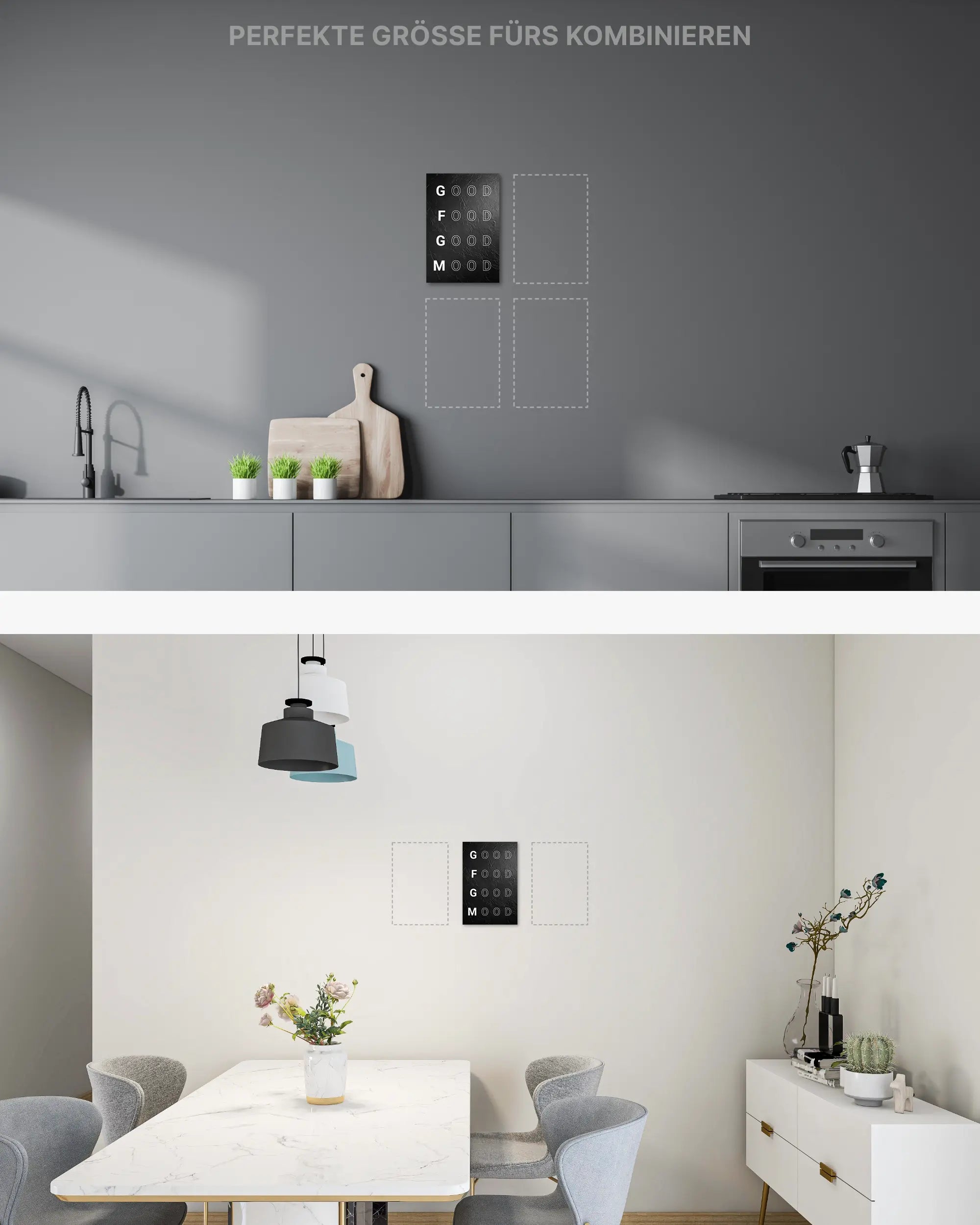 Bei deiner „Good Food Good Mood“ Poster Plate ist das Magnet-Kit inklusive. Damit kannst du das Kunststück ganz ohne Bohren, Hämmern oder Rahmen an die Wand hängen und genießt dabei folgende Vorteile:
