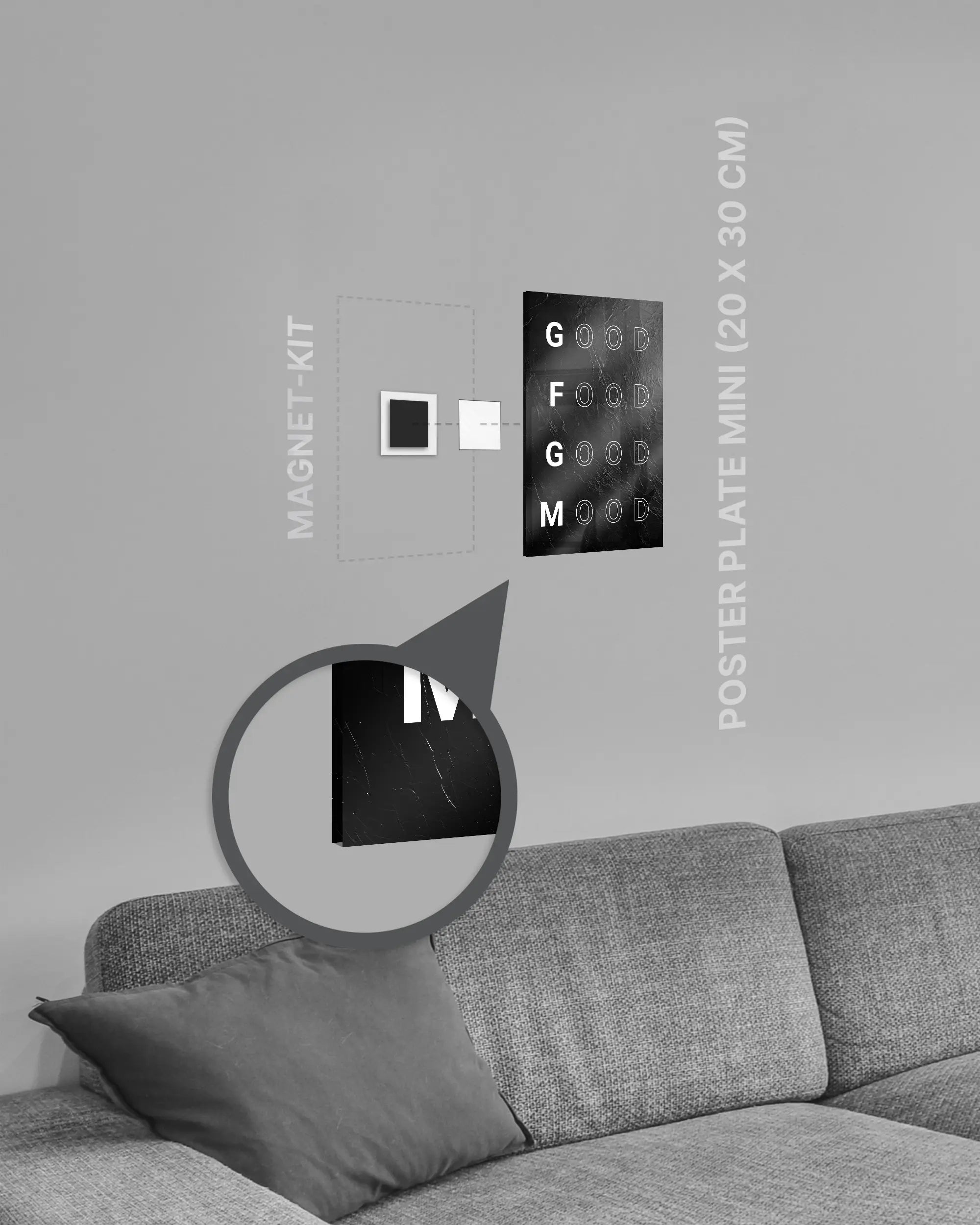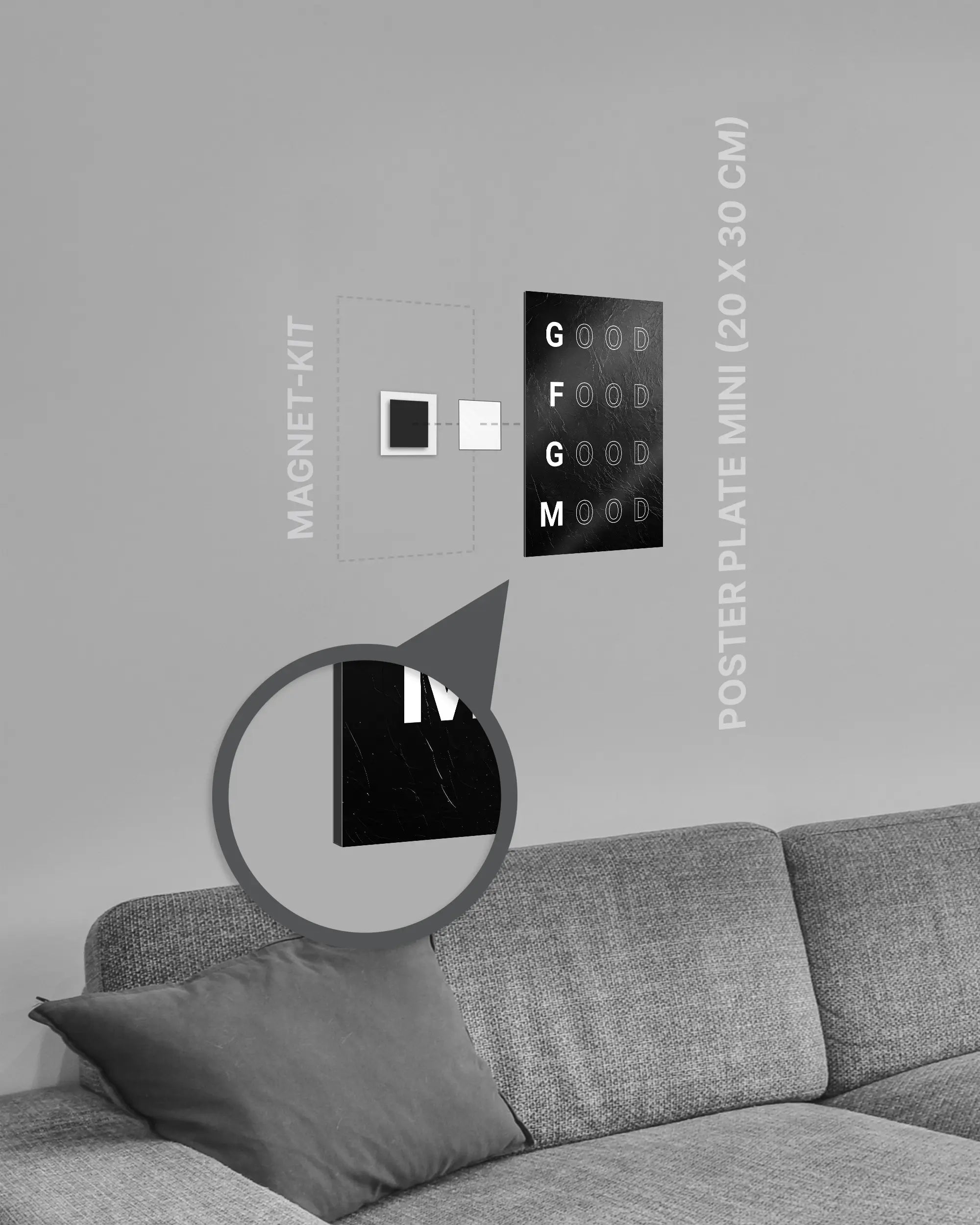Deine Poster Plate wird mit dem jeweils passenden Magnofix® Magnet-Kit geliefert. Dadurch lässt sie sich an fast allen geraden Flächen aufhängen.