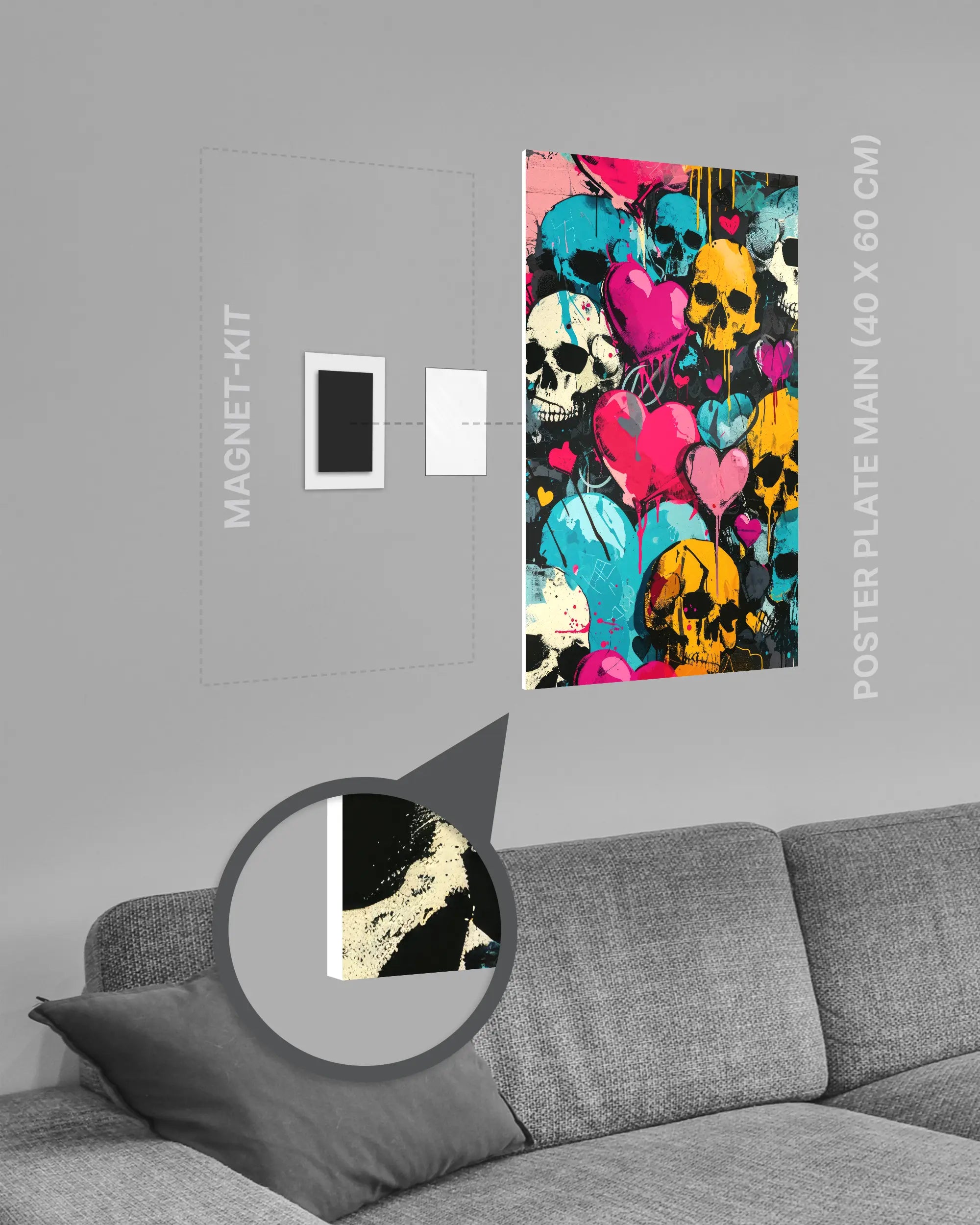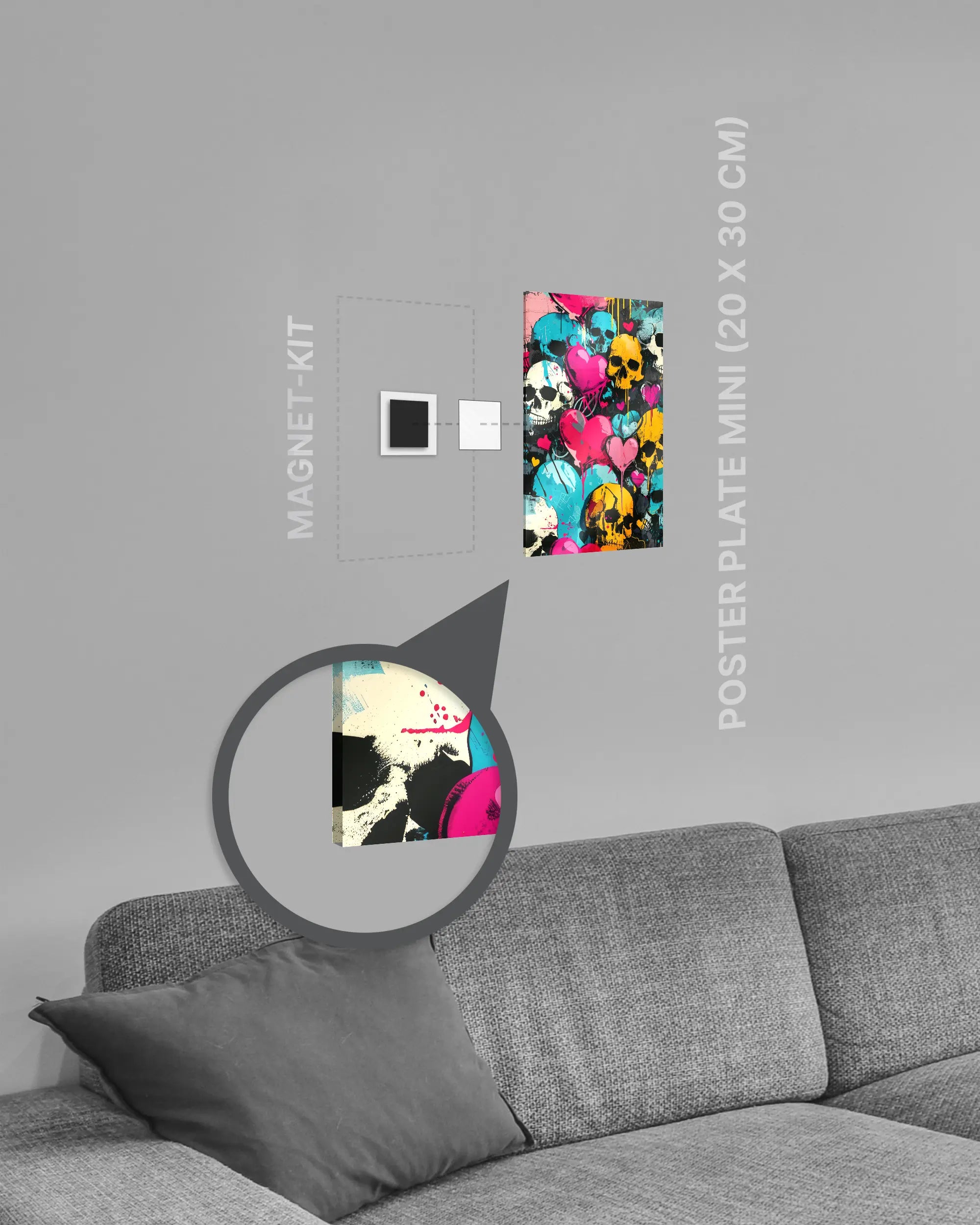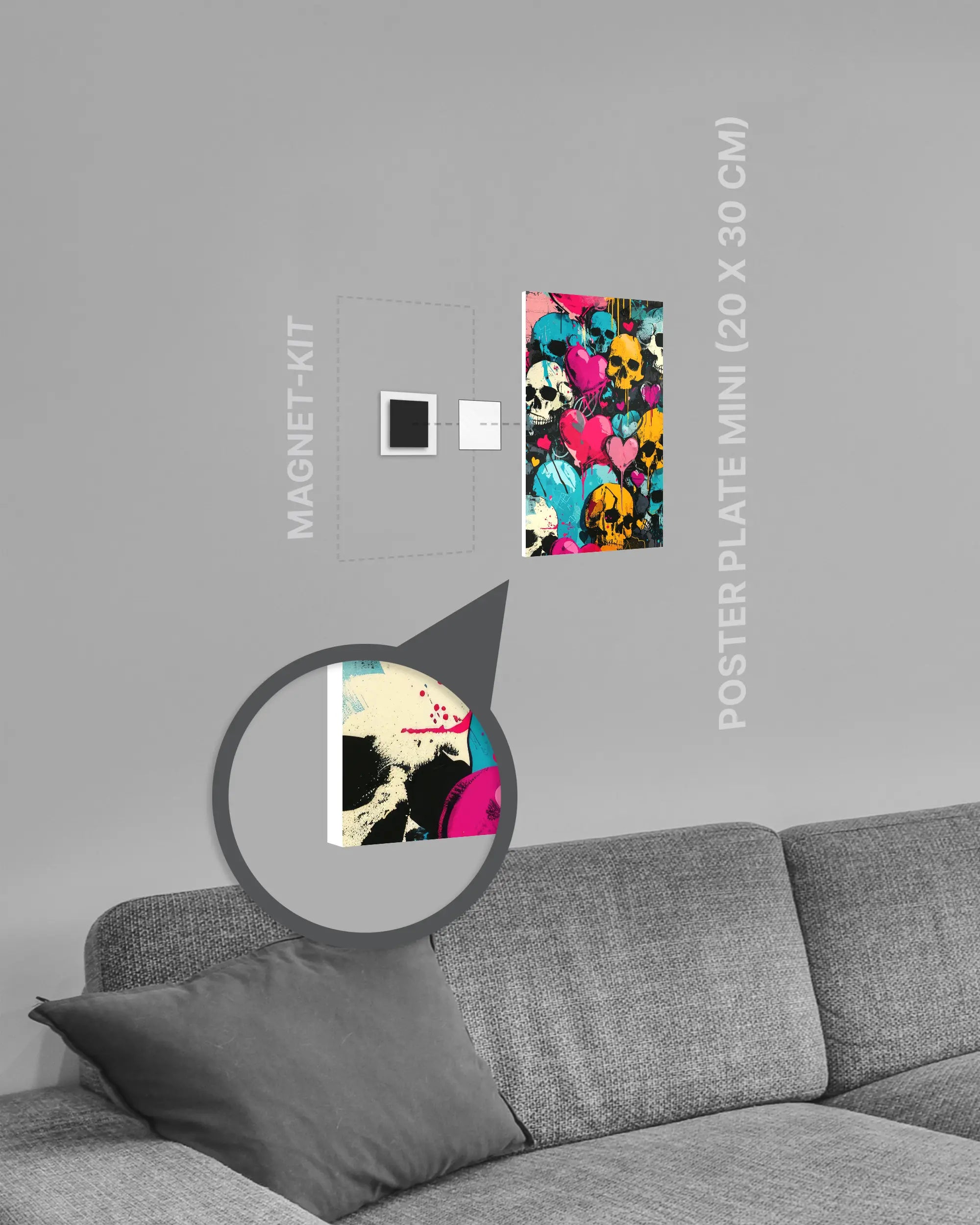 Bei deiner „Happy Schädeltime“ Poster Plate ist das Magnet-Kit inklusive. Damit kannst du das Kunststück ganz ohne Bohren, Hämmern oder Rahmen an die Wand hängen und genießt dabei folgende Vorteile: