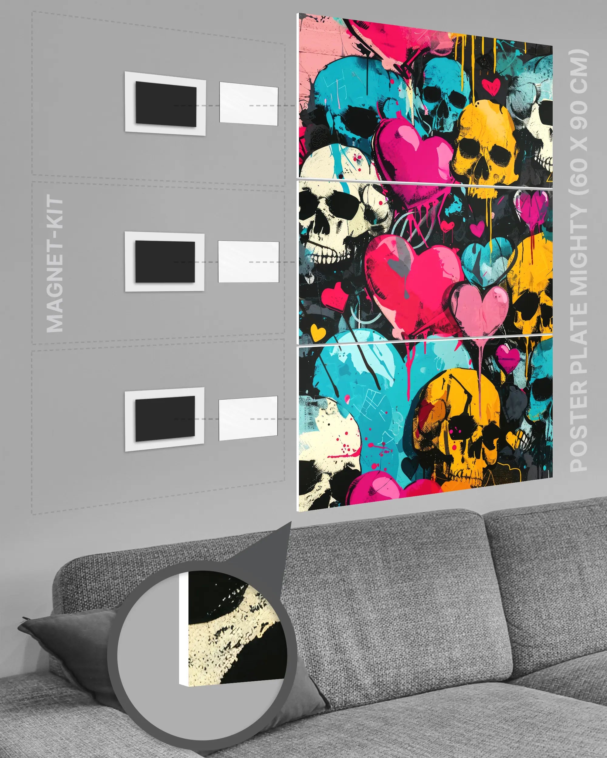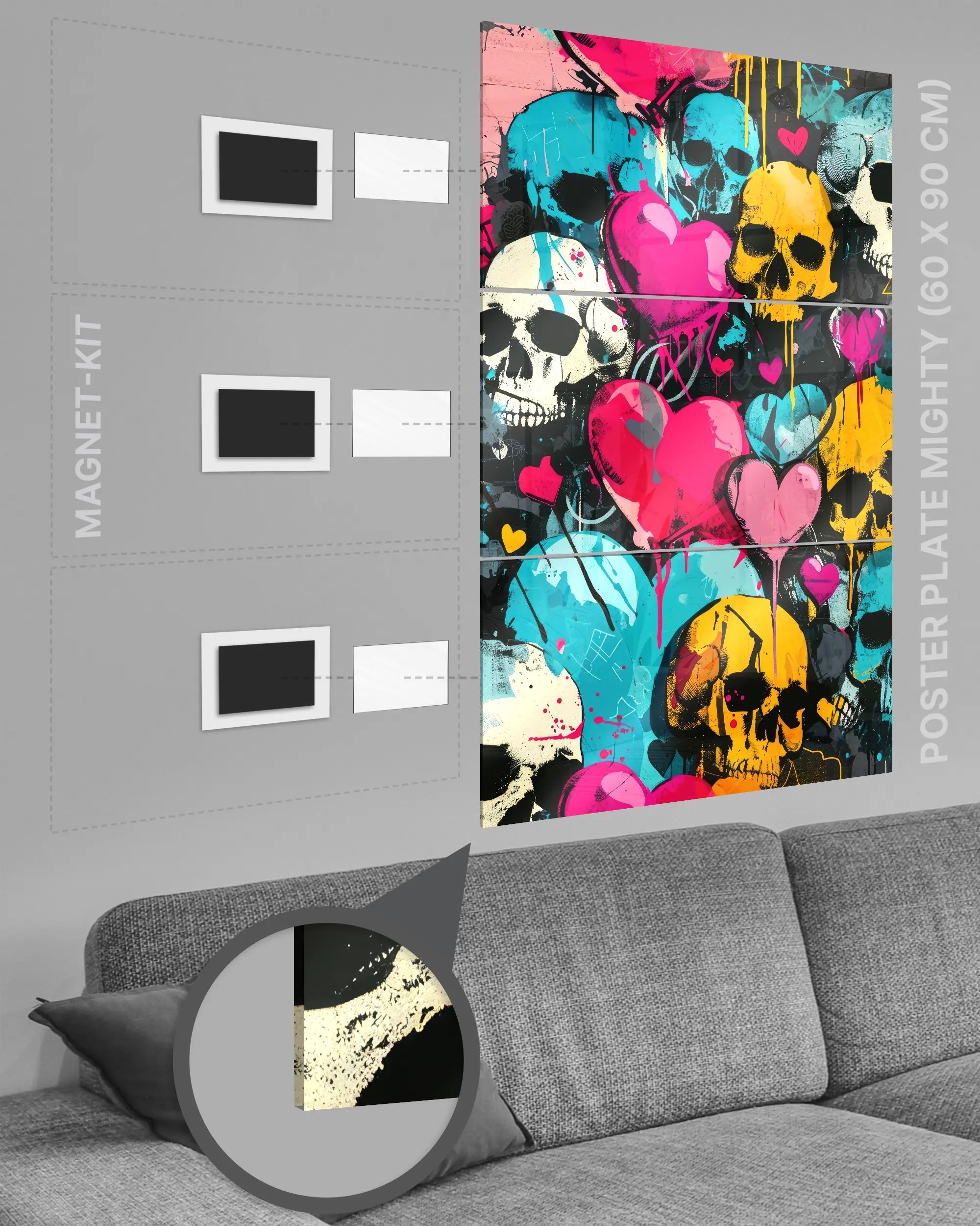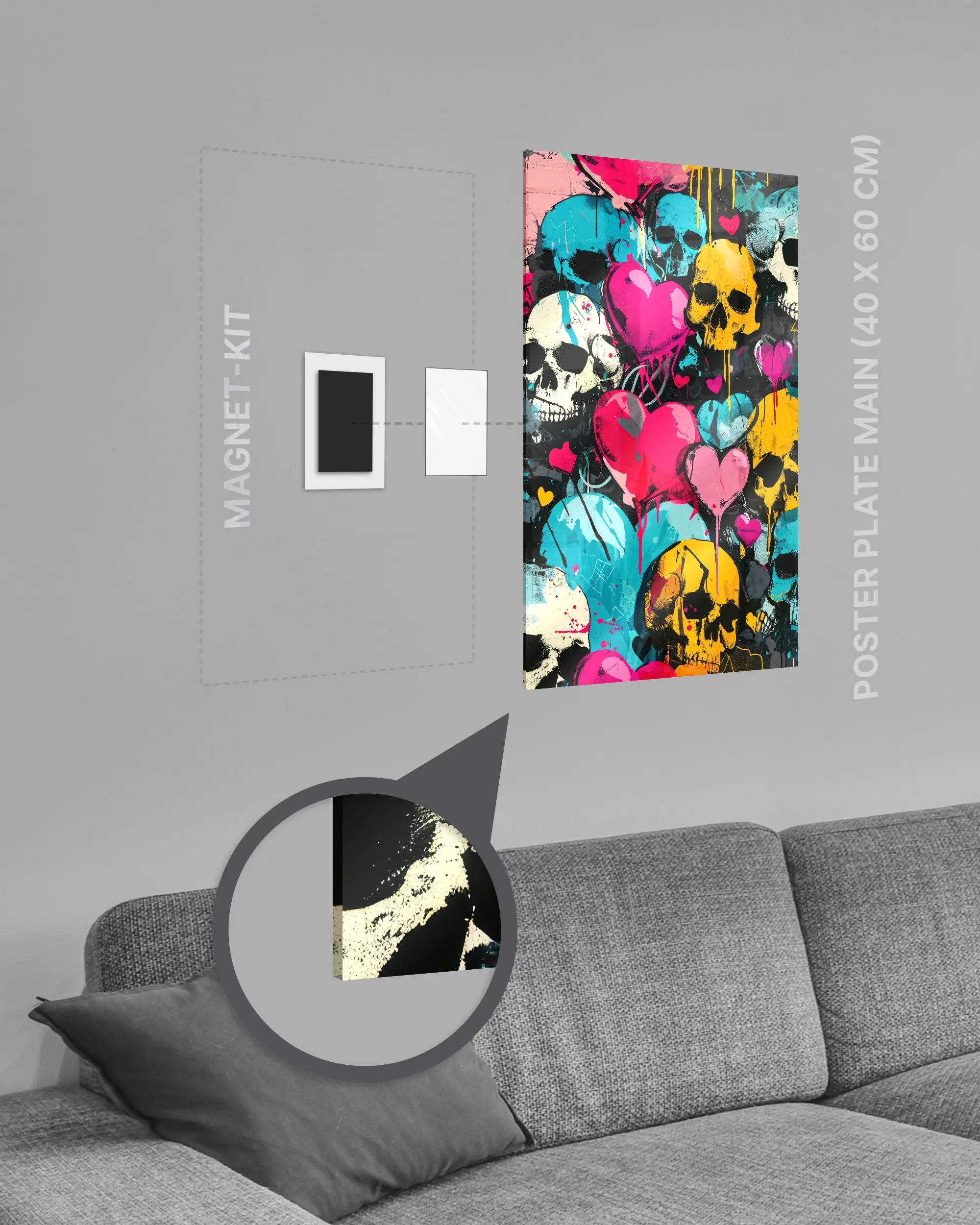 Bei deiner „Happy Schädeltime“ Poster Plate ist das Magnet-Kit inklusive. Damit kannst du das Kunststück ganz ohne Bohren, Hämmern oder Rahmen an die Wand hängen und genießt dabei folgende Vorteile: