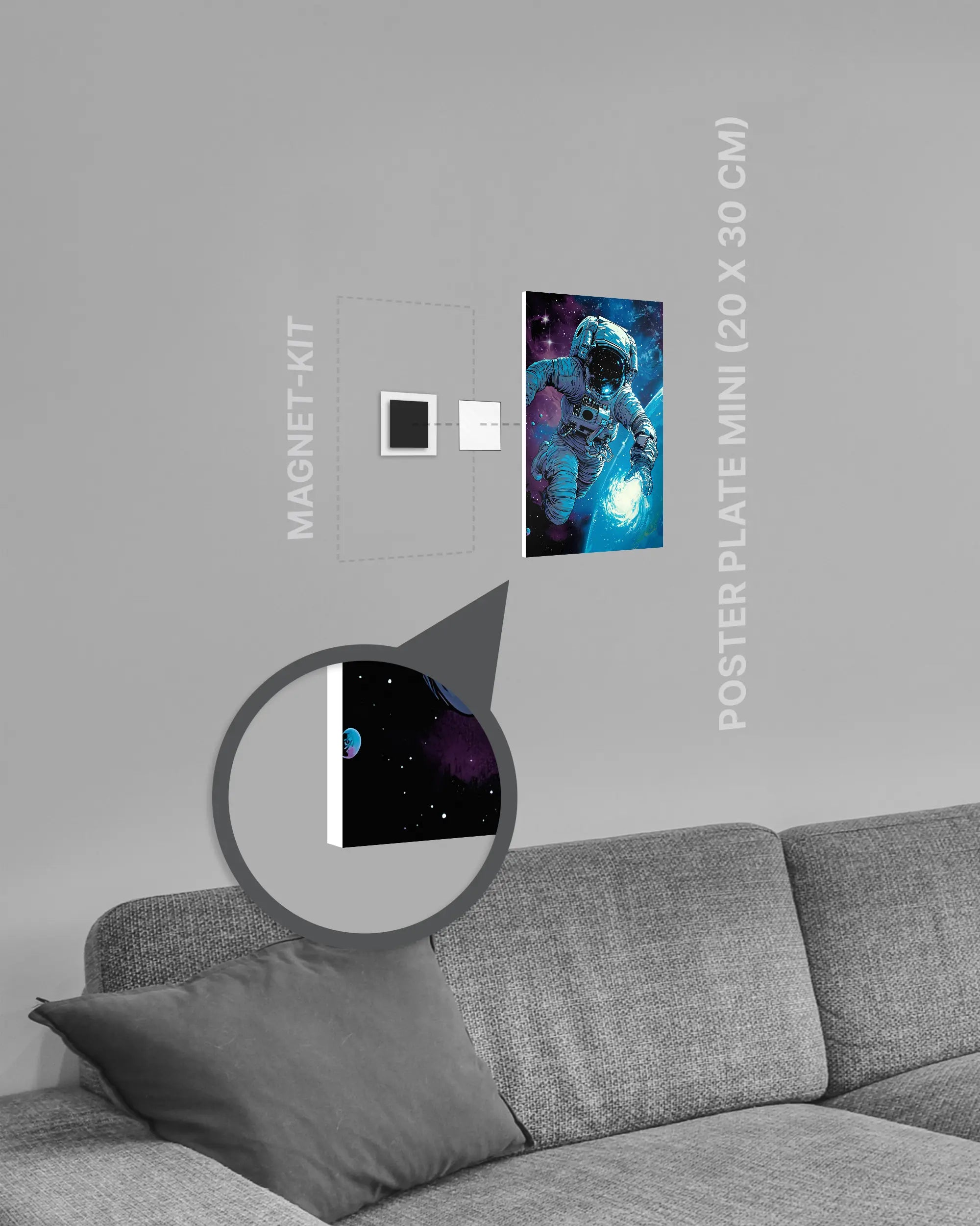 Deine Poster Plate wird mit dem jeweils passenden Magnofix® Magnet-Kit geliefert. Dadurch lässt sie sich an fast allen geraden Flächen aufhängen.