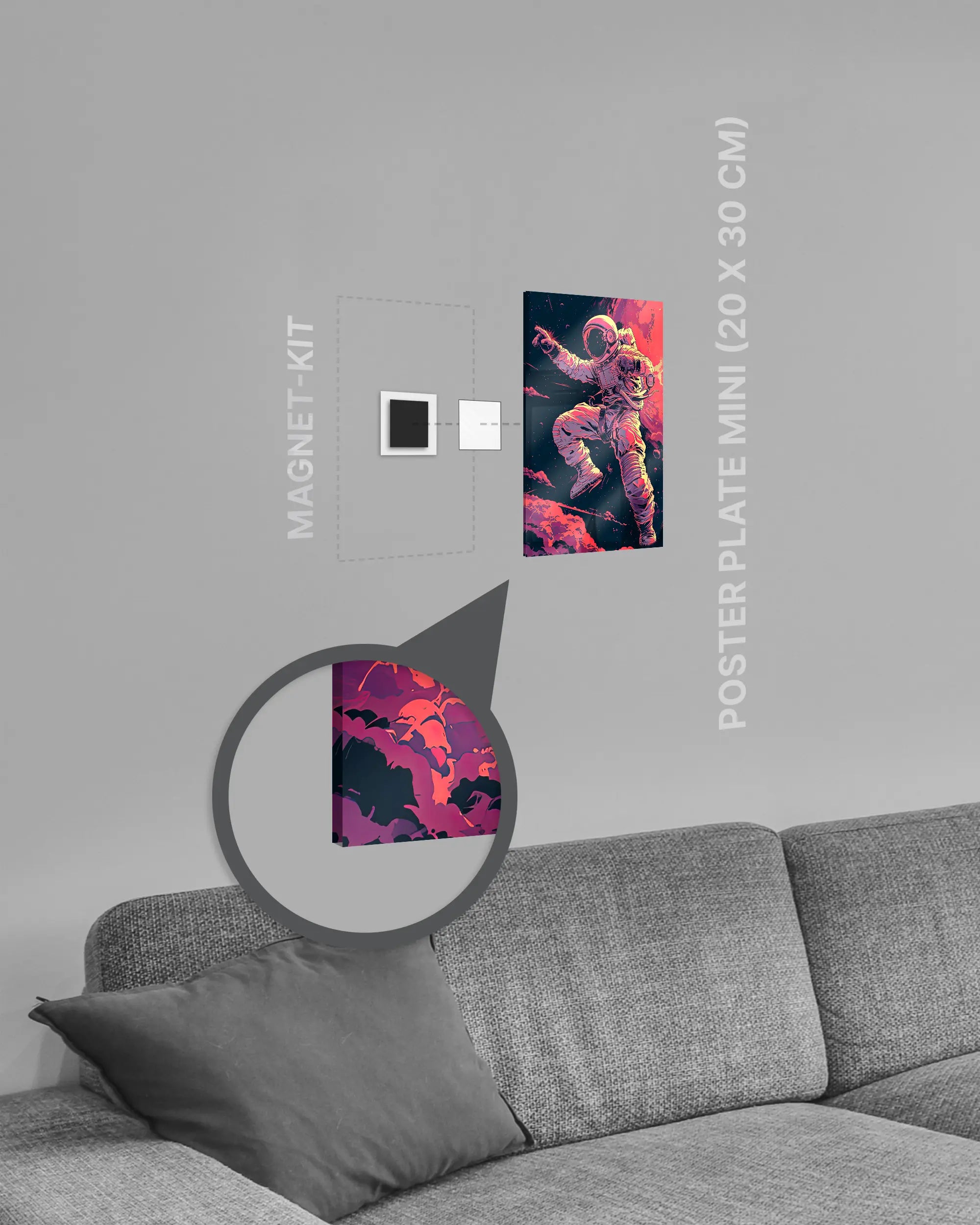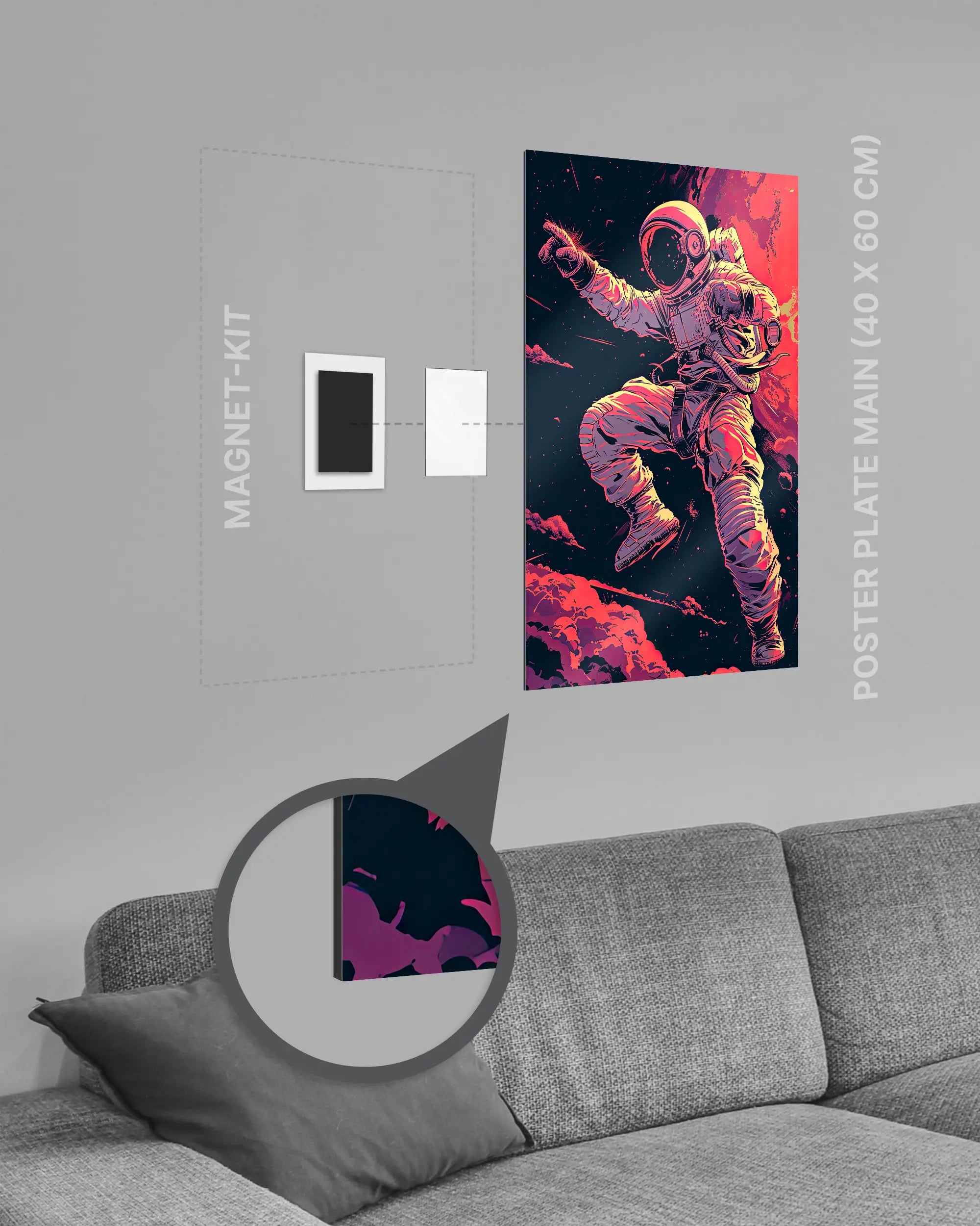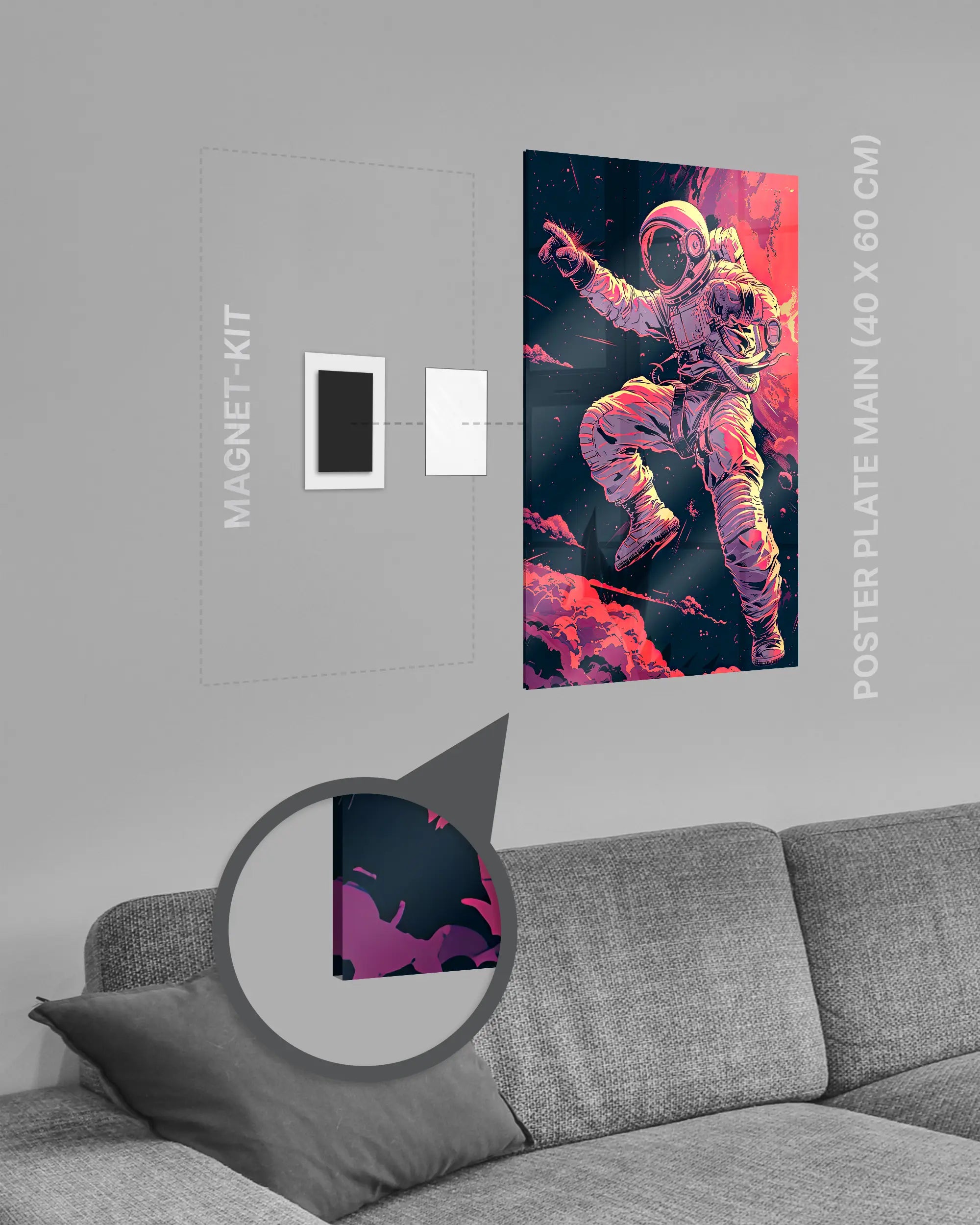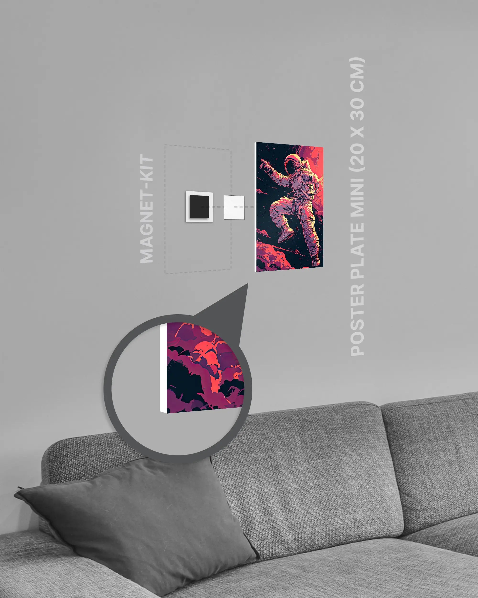 Bei deiner „Space Stylin'“ Poster Plate ist das Magnet-Kit inklusive. Damit kannst du das Kunststück ganz ohne Bohren, Hämmern oder Rahmen an die Wand hängen und genießt dabei folgende Vorteile: