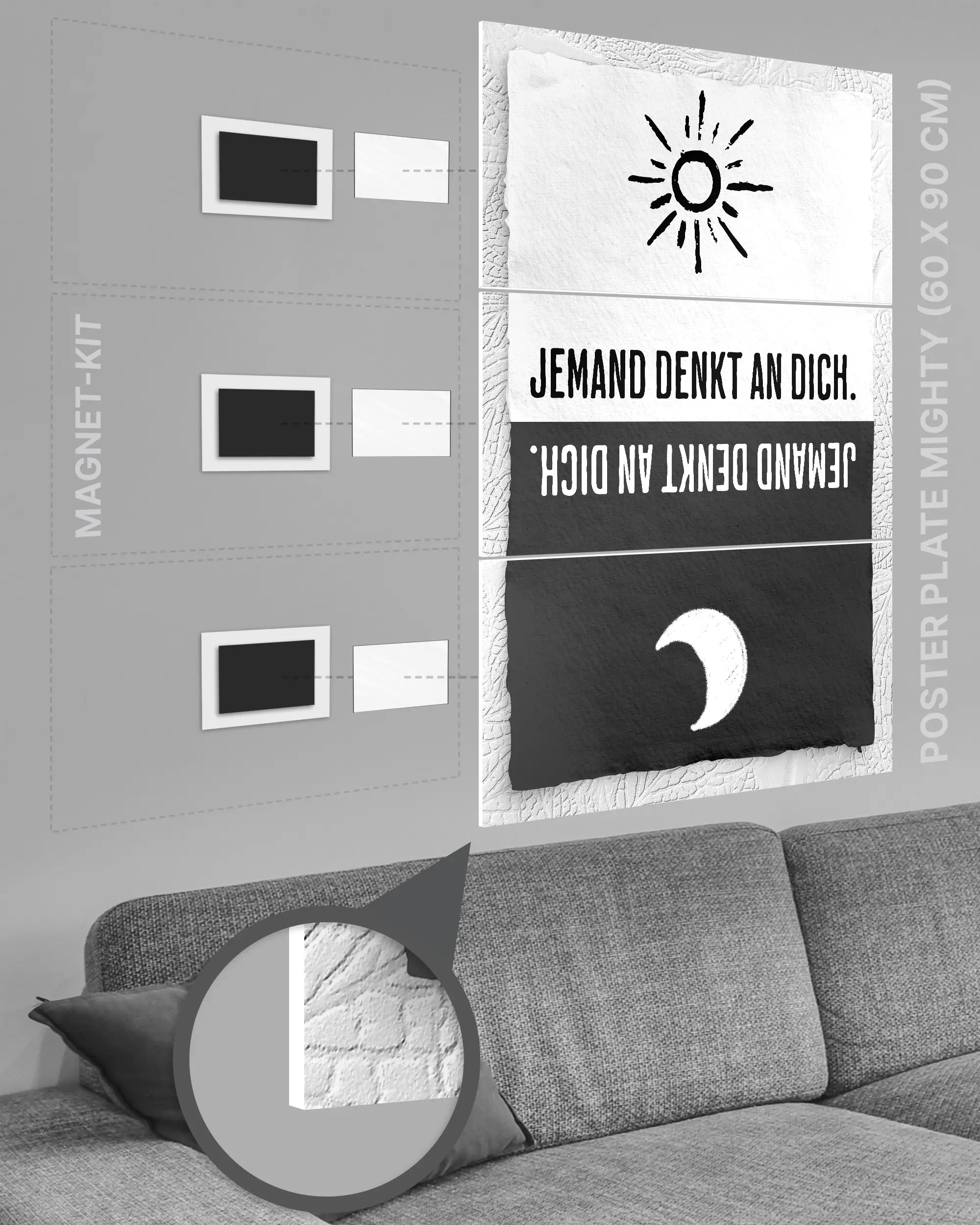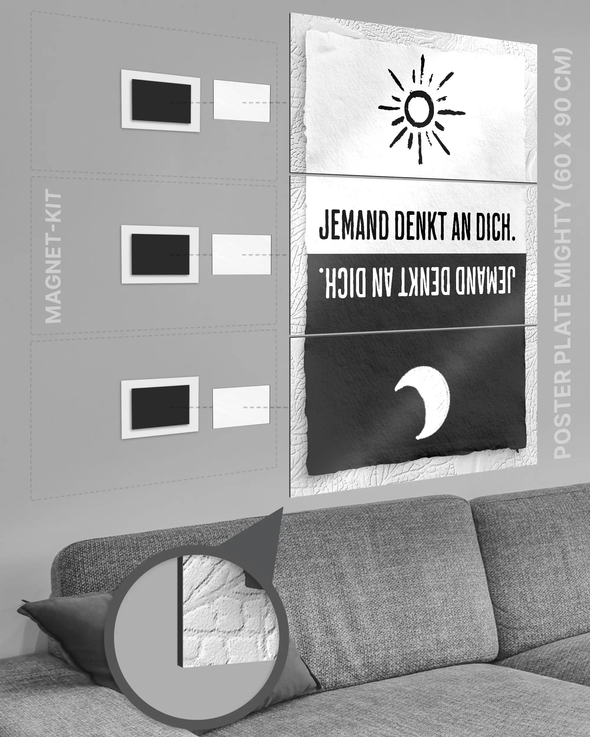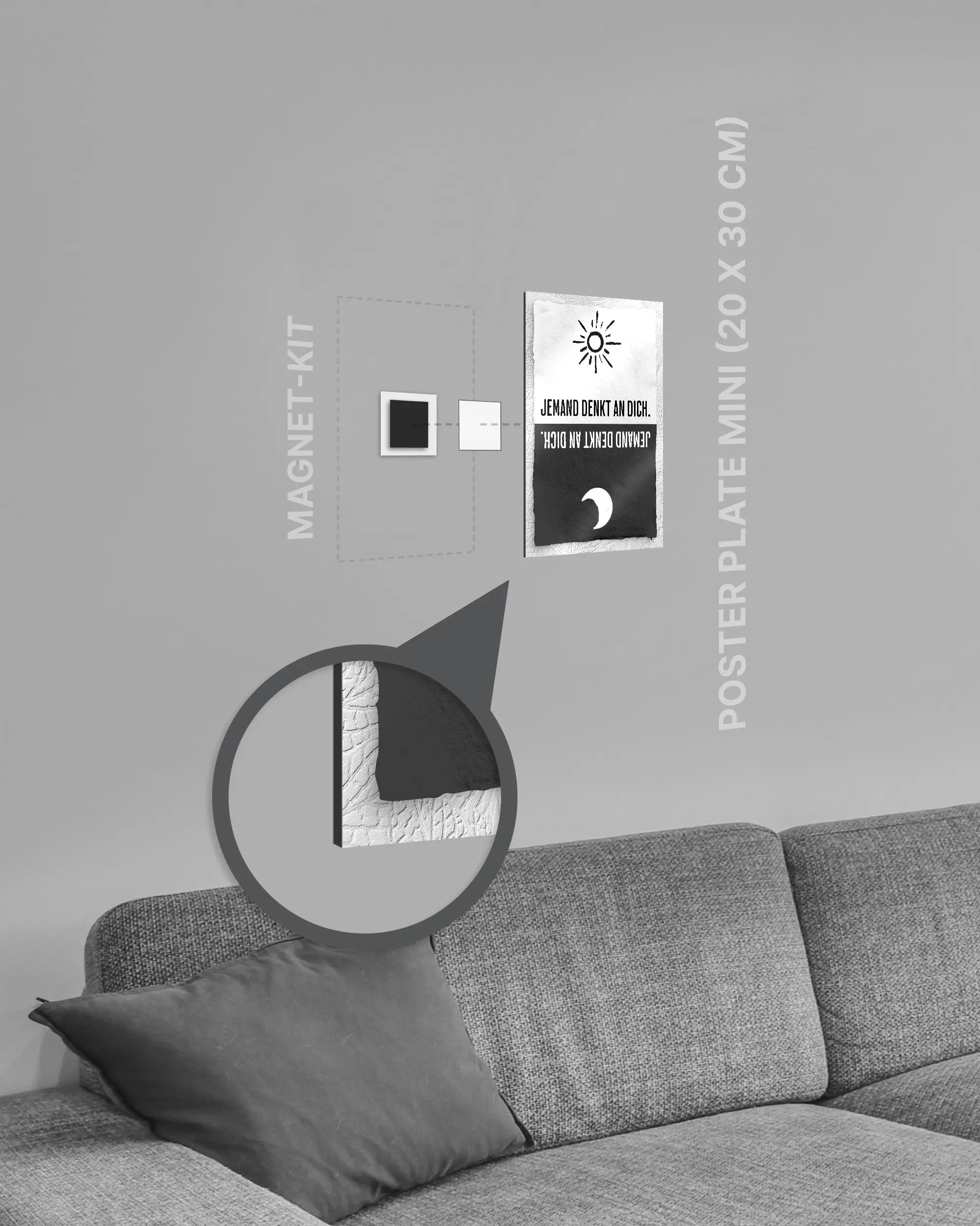 Deine Poster Plate wird mit dem jeweils passenden Magnofix® Magnet-Kit geliefert. Dadurch lässt sie sich an fast allen geraden Flächen aufhängen.
