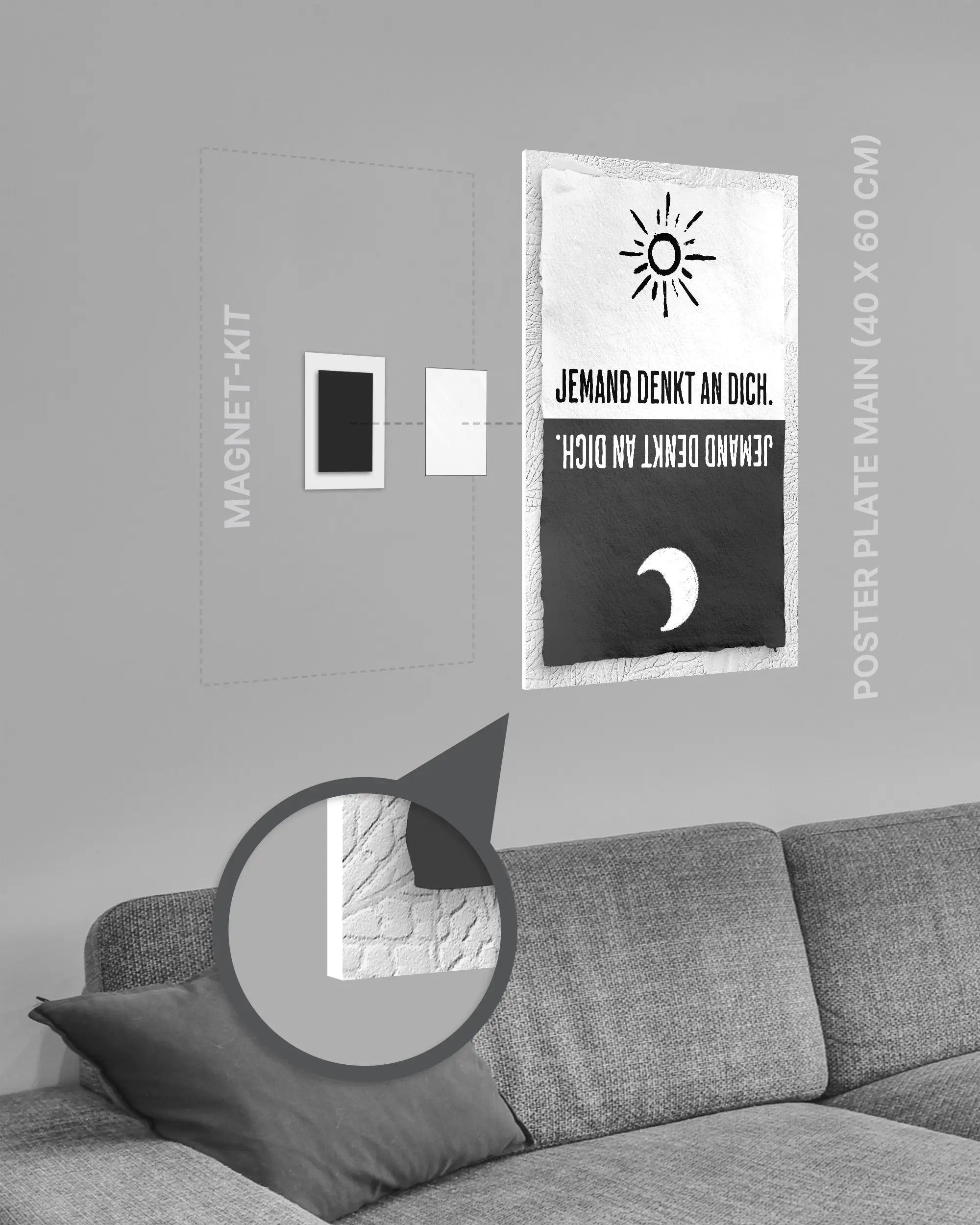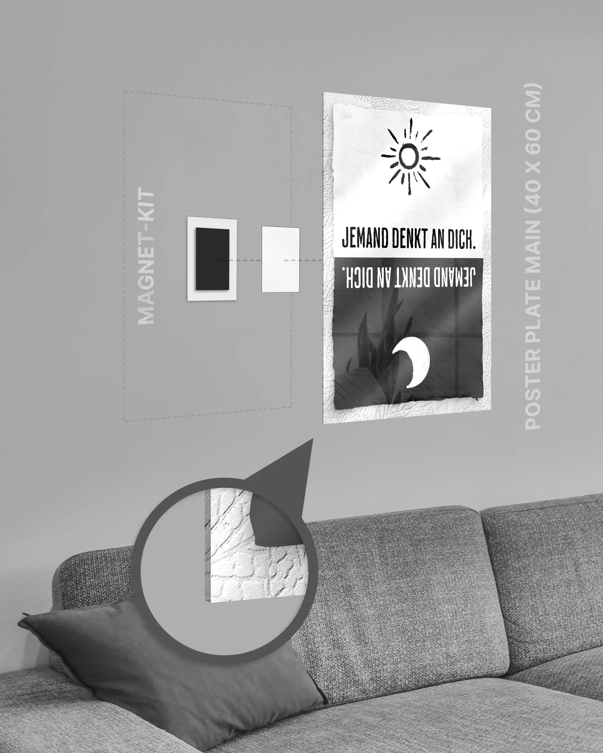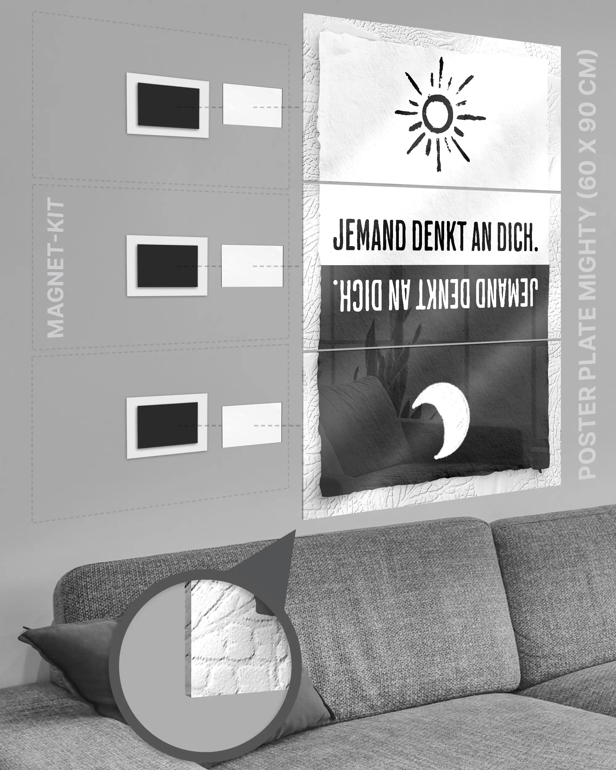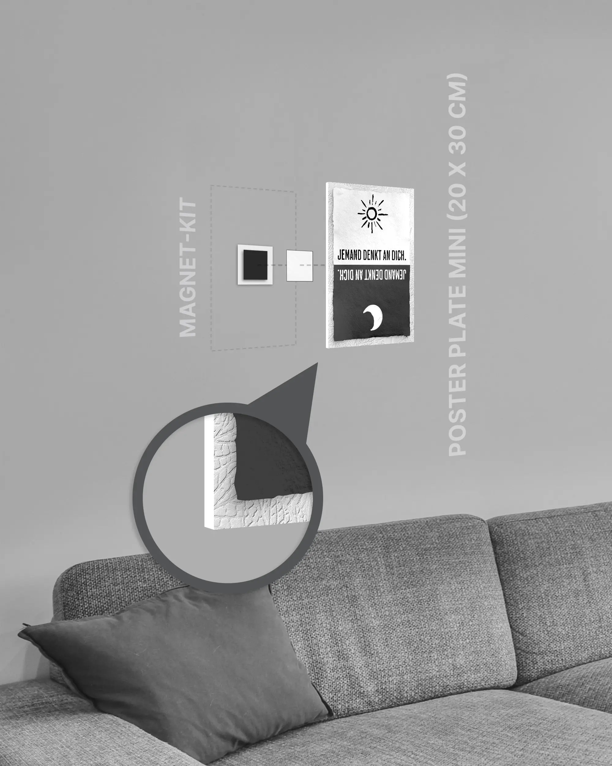Deine Poster Plate wird mit dem jeweils passenden Magnofix® Magnet-Kit geliefert. Dadurch lässt sie sich an fast allen geraden Flächen aufhängen.