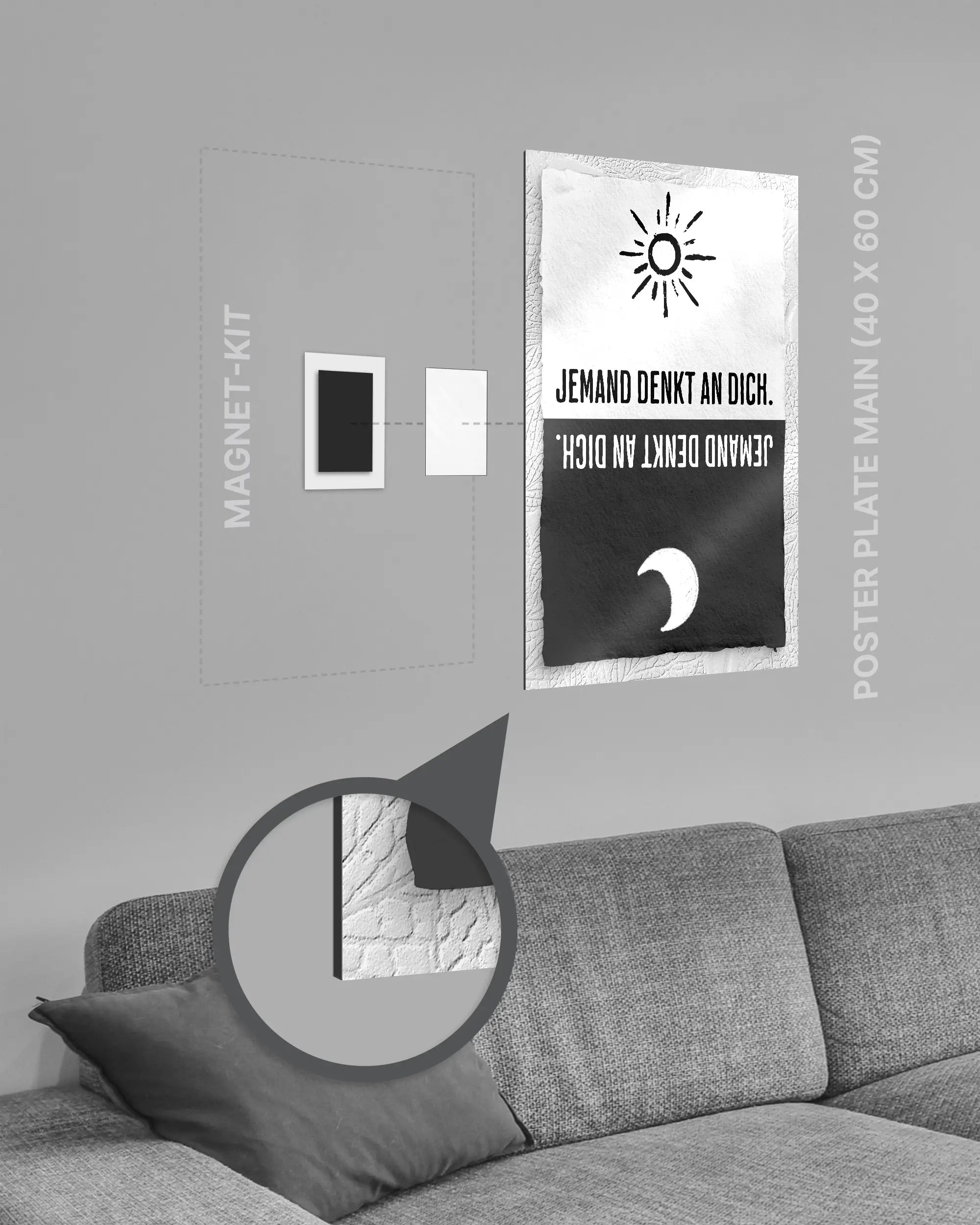 Bei deiner „Tag und Nacht“ Poster Plate ist das Magnet-Kit inklusive. Damit kannst du das Kunststück ganz ohne Bohren, Hämmern oder Rahmen an die Wand hängen und genießt dabei folgende Vorteile: