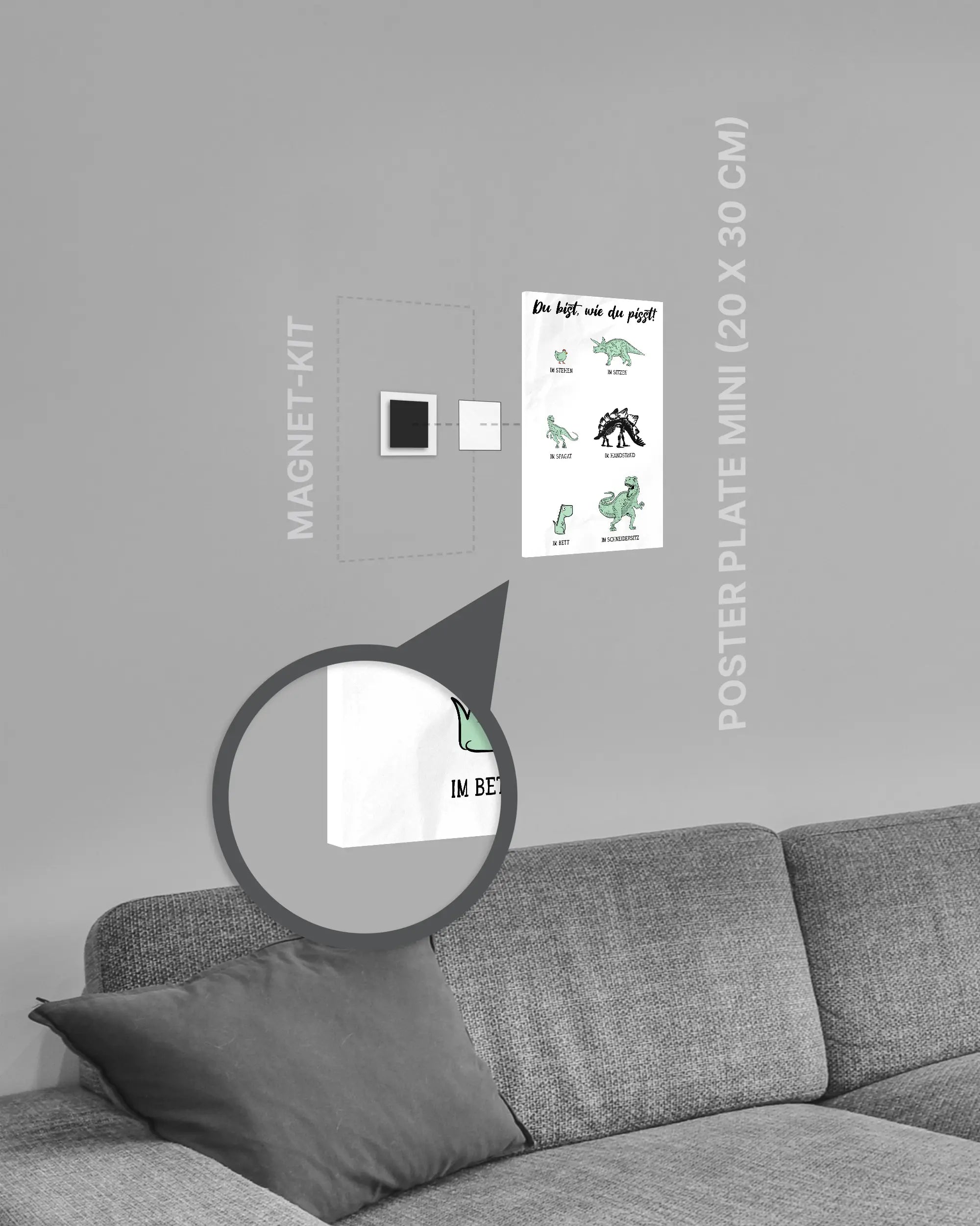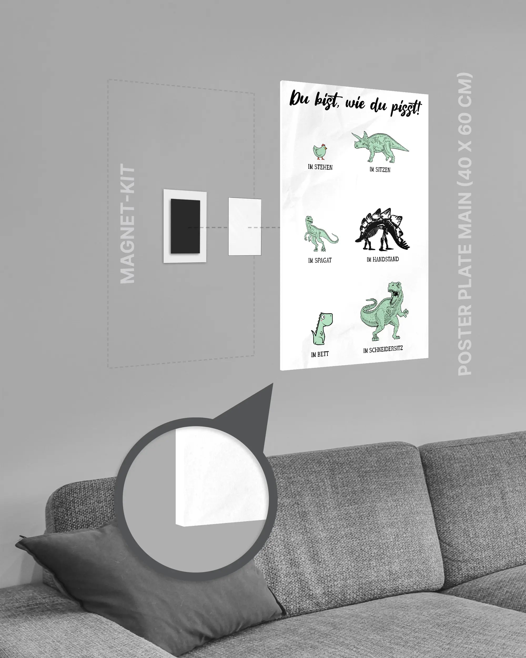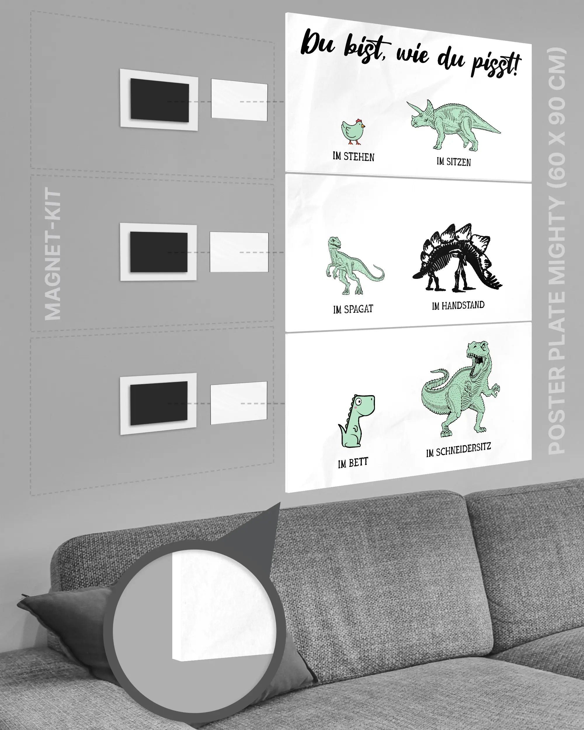 Bei deiner „Urintest“ Poster Plate ist das Magnet-Kit inklusive. Damit kannst du das Kunststück ganz ohne Bohren, Hämmern oder Rahmen an die Wand hängen und genießt dabei folgende Vorteile: